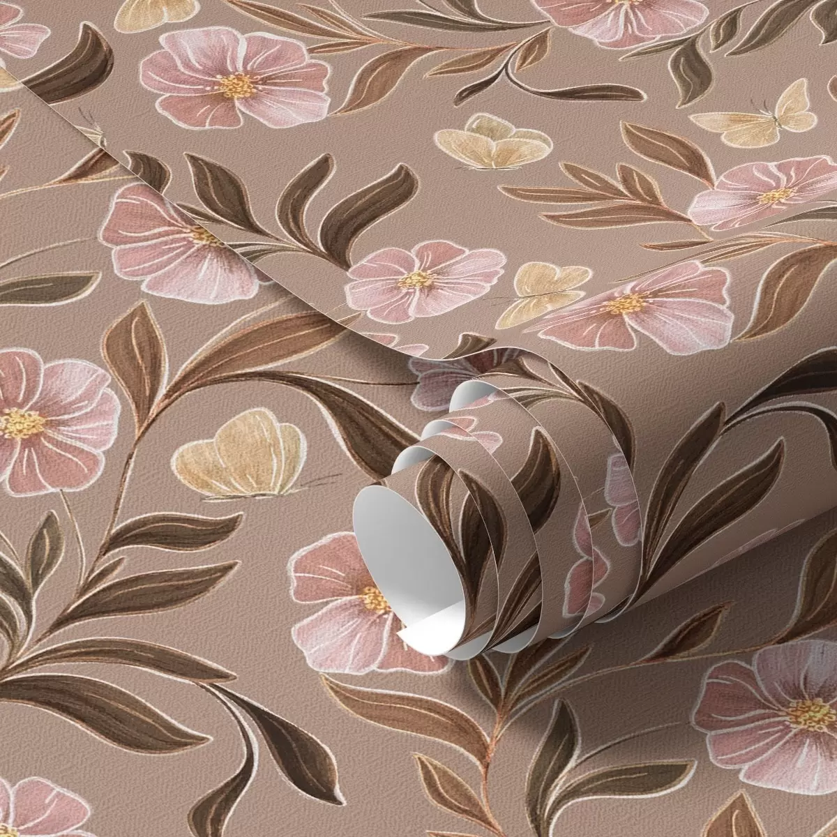 Papel tapiz Flores rosas y mariposas sobre un cálido fondo marrón Nr. a00633v1