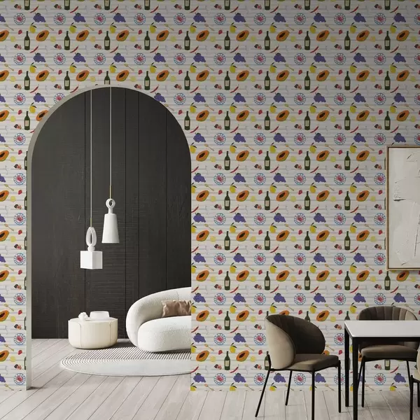 Papel tapiz Lámina de cocina con frutas, vasos y platos Nr. a00638