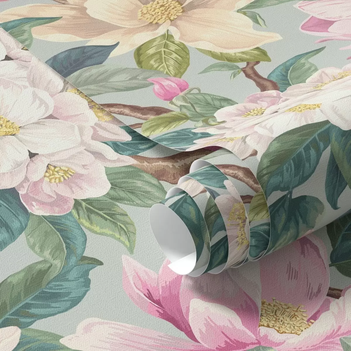 Papel tapiz Magnolias y flores blancas sobre fondo gris menta Nr. a00644