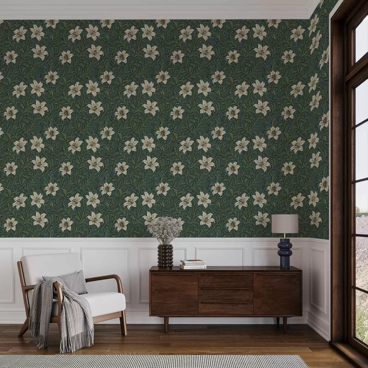 Papel tapiz Lirios crema entre una densa vegetación sobre un fondo turquesa Nr. a00645