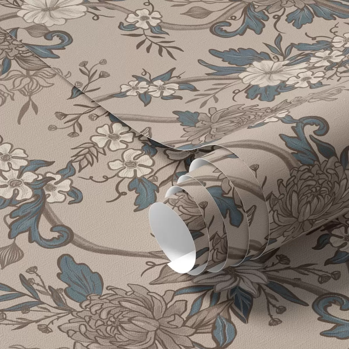 Papel tapiz Flores grandes con hojas estampadas sobre un fondo beige cálido Nr. a00649