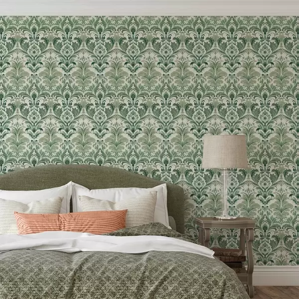 Papel tapiz Damasco verde con textura en relieve sobre fondo claro Nr. a00692