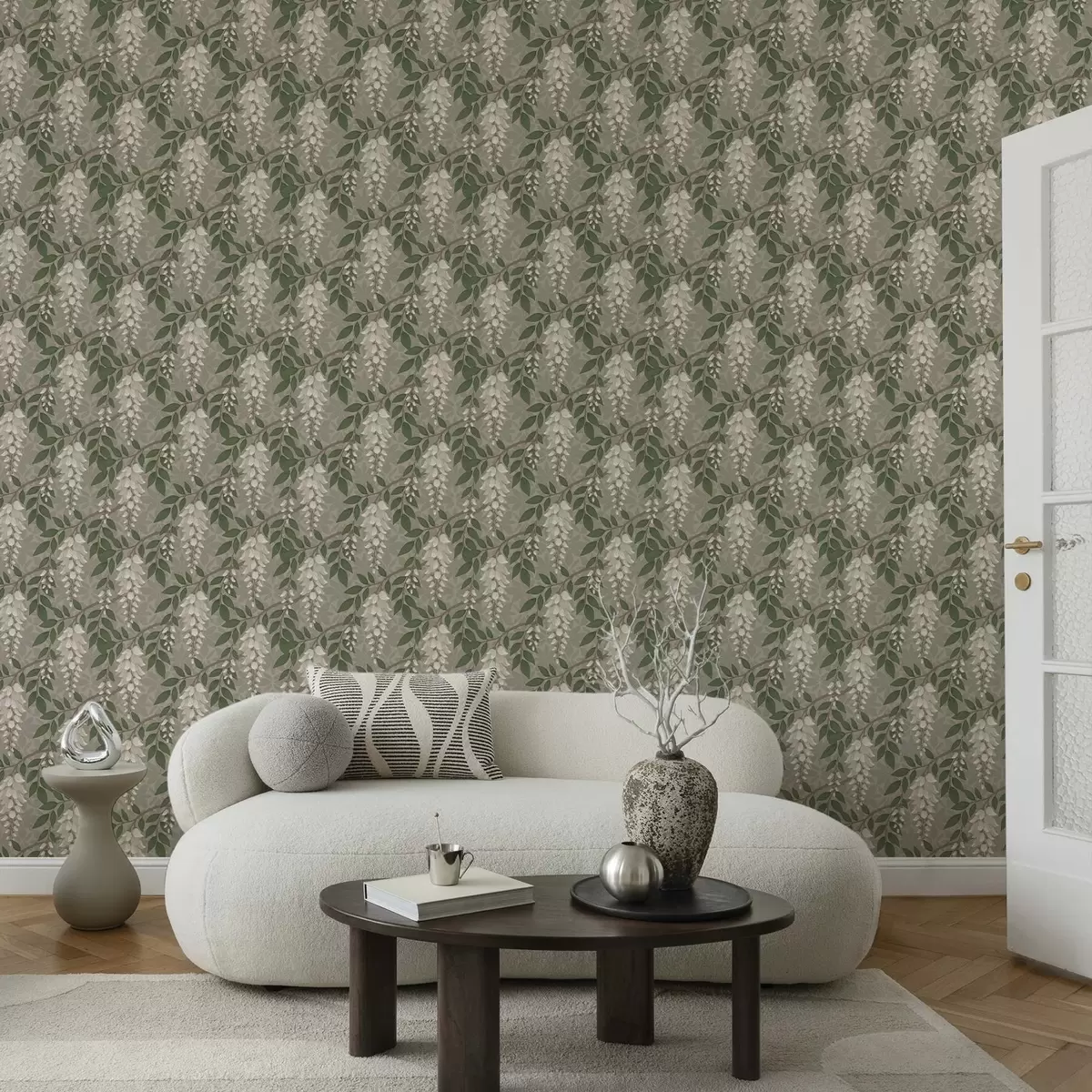 Papel tapiz Glicinia clara sobre fondo gris oliva, racimos en cascada Nr. a00694