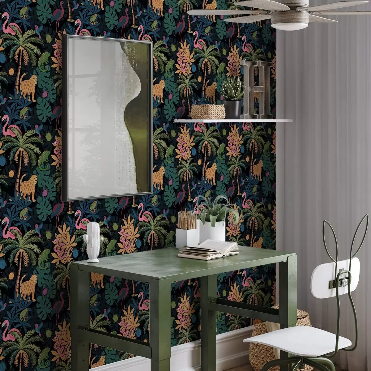 Papel tapiz Animales tropicales brillantes entre el follaje sobre un fondo oscuro Nr. a00701