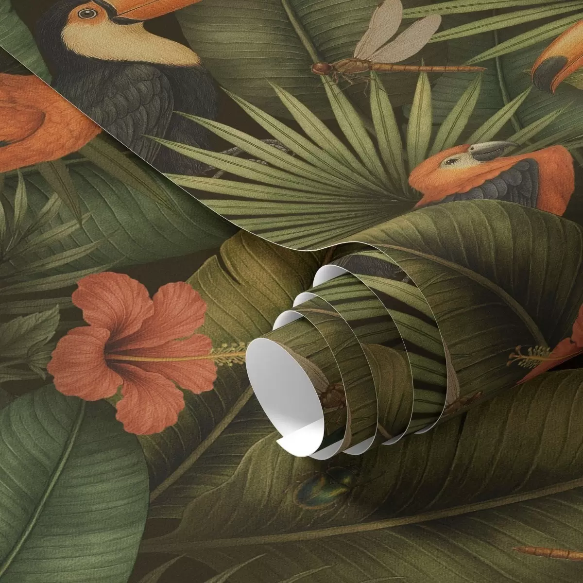 Papel tapiz Tucanes y loros entre el follaje y las flores tropicales Nr. a00702