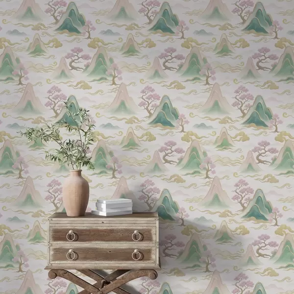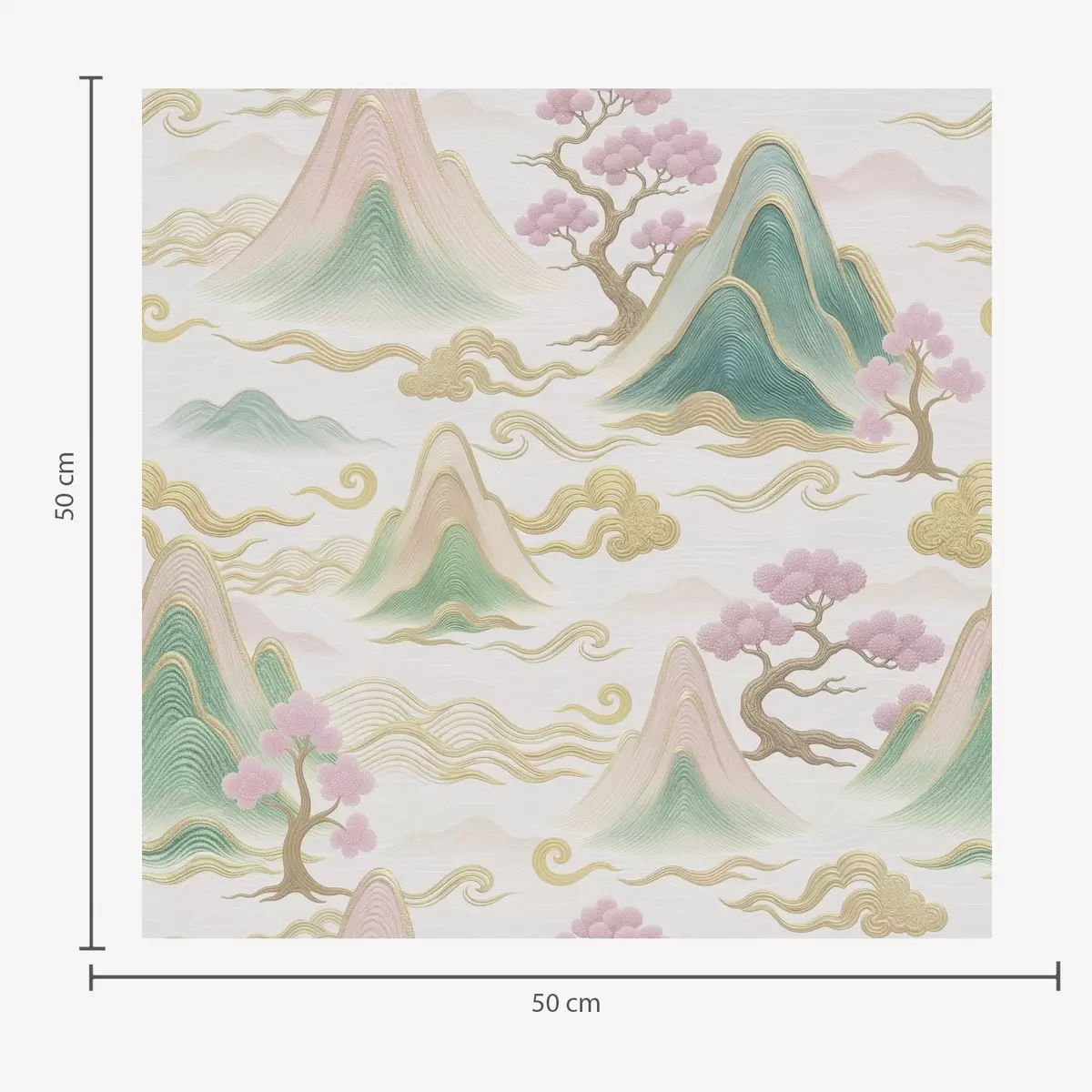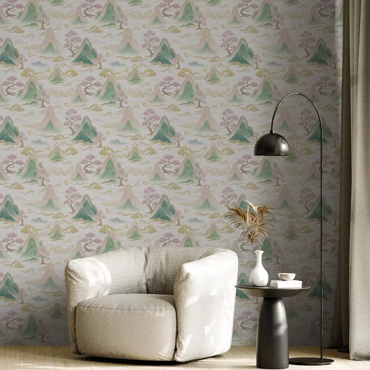 Papel tapiz Montañas, nubes y pinos en un estilo decorativo oriental Nr. a00703