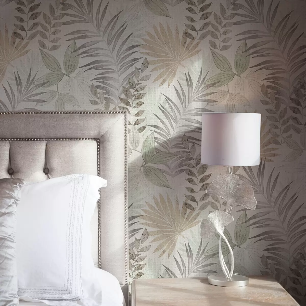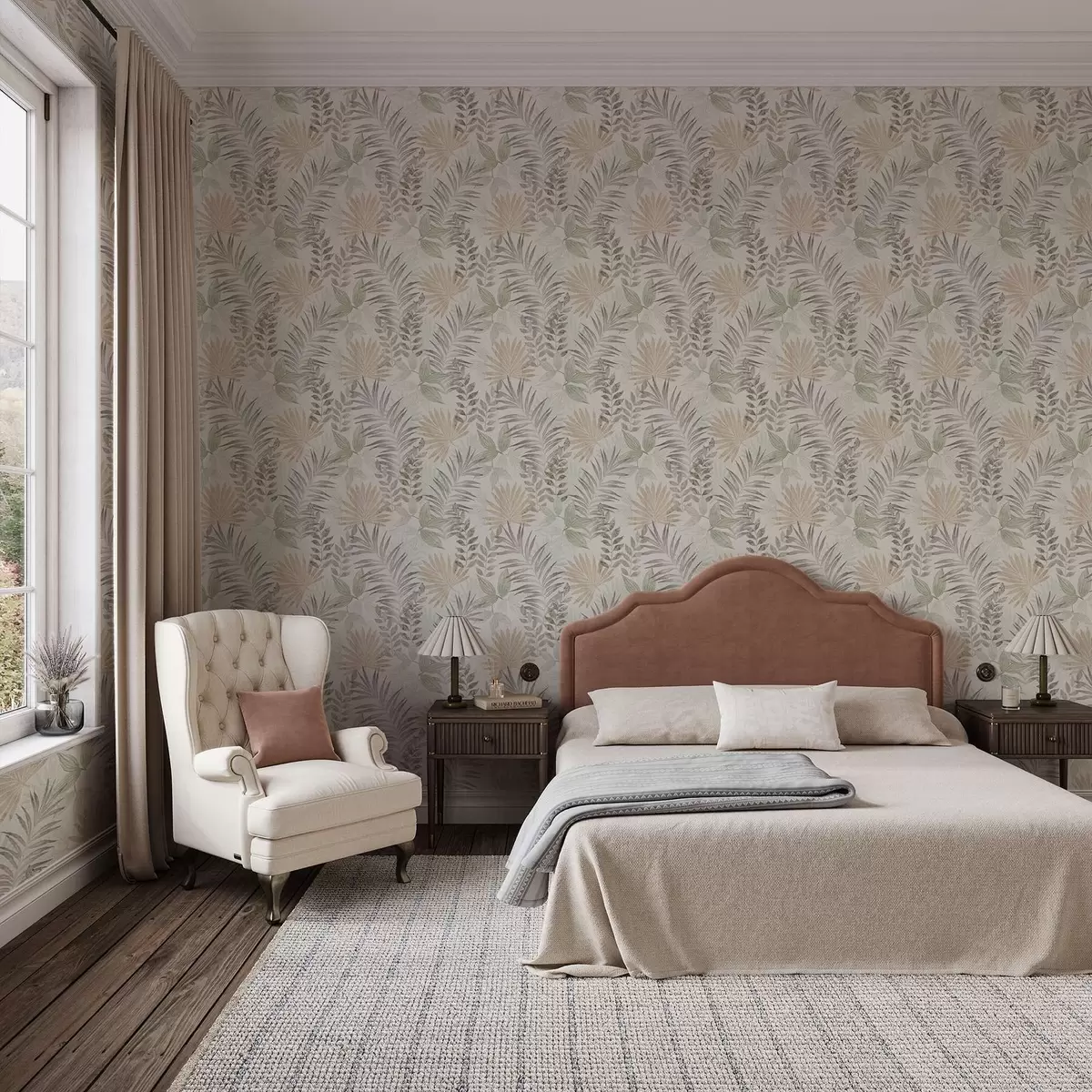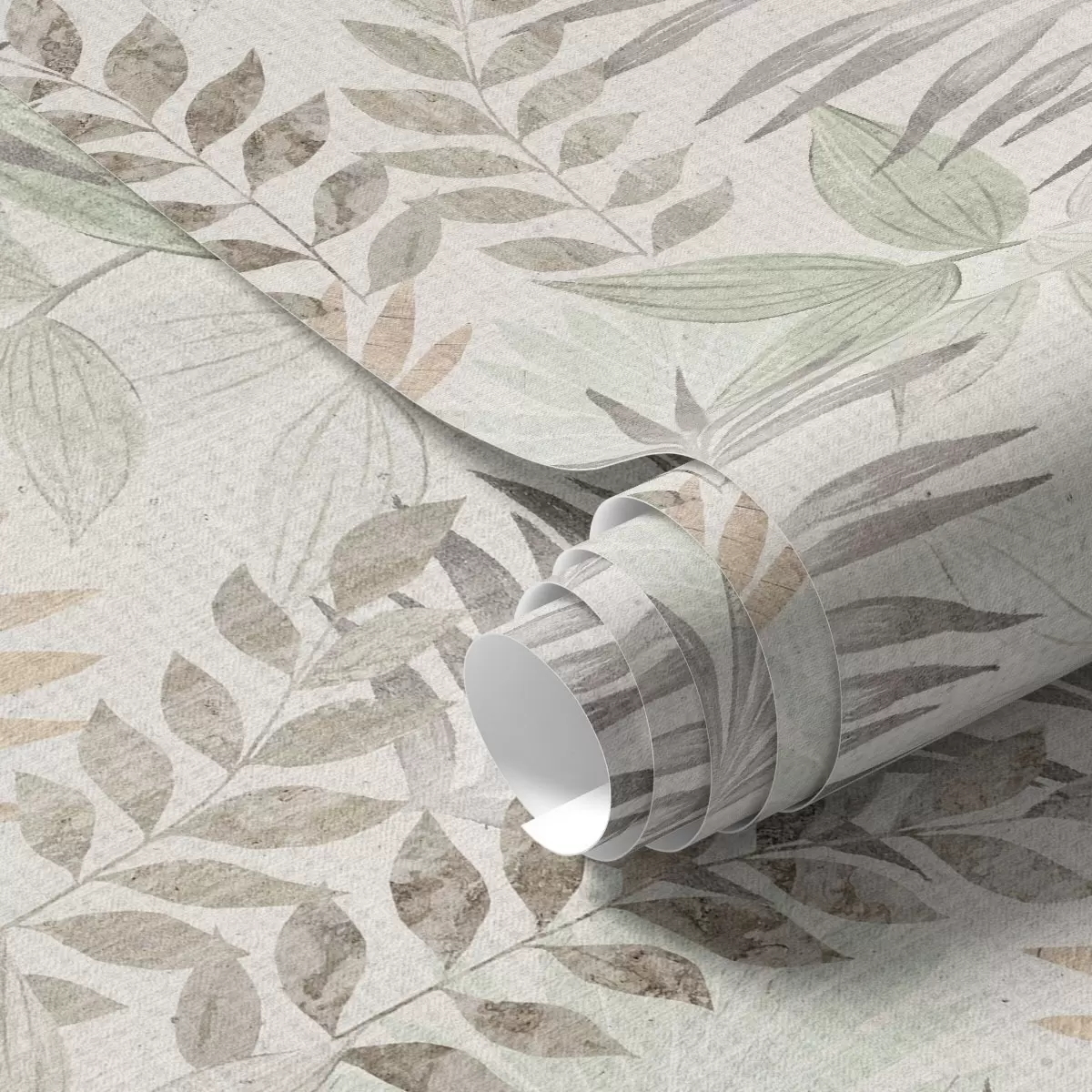 Papel tapiz Hojas tropicales en tonos pastel sobre un fondo claro, textura sutil Nr. a00725