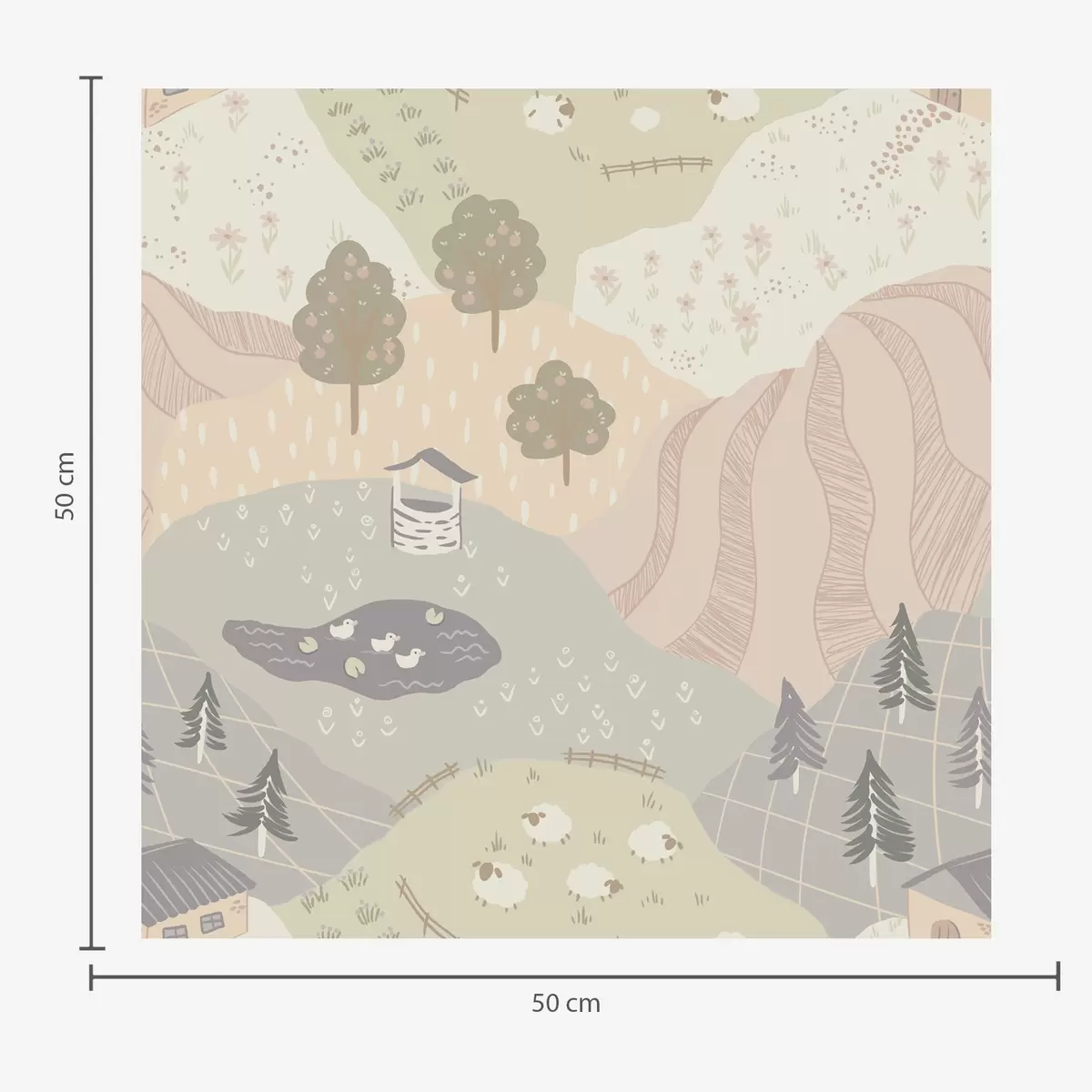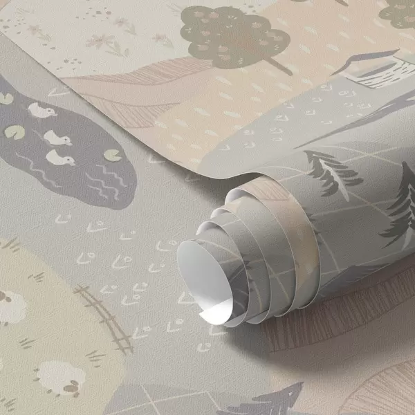Papel tapiz Campiña de cuento de hadas con árboles, gansos y ovejas Nr. a00728