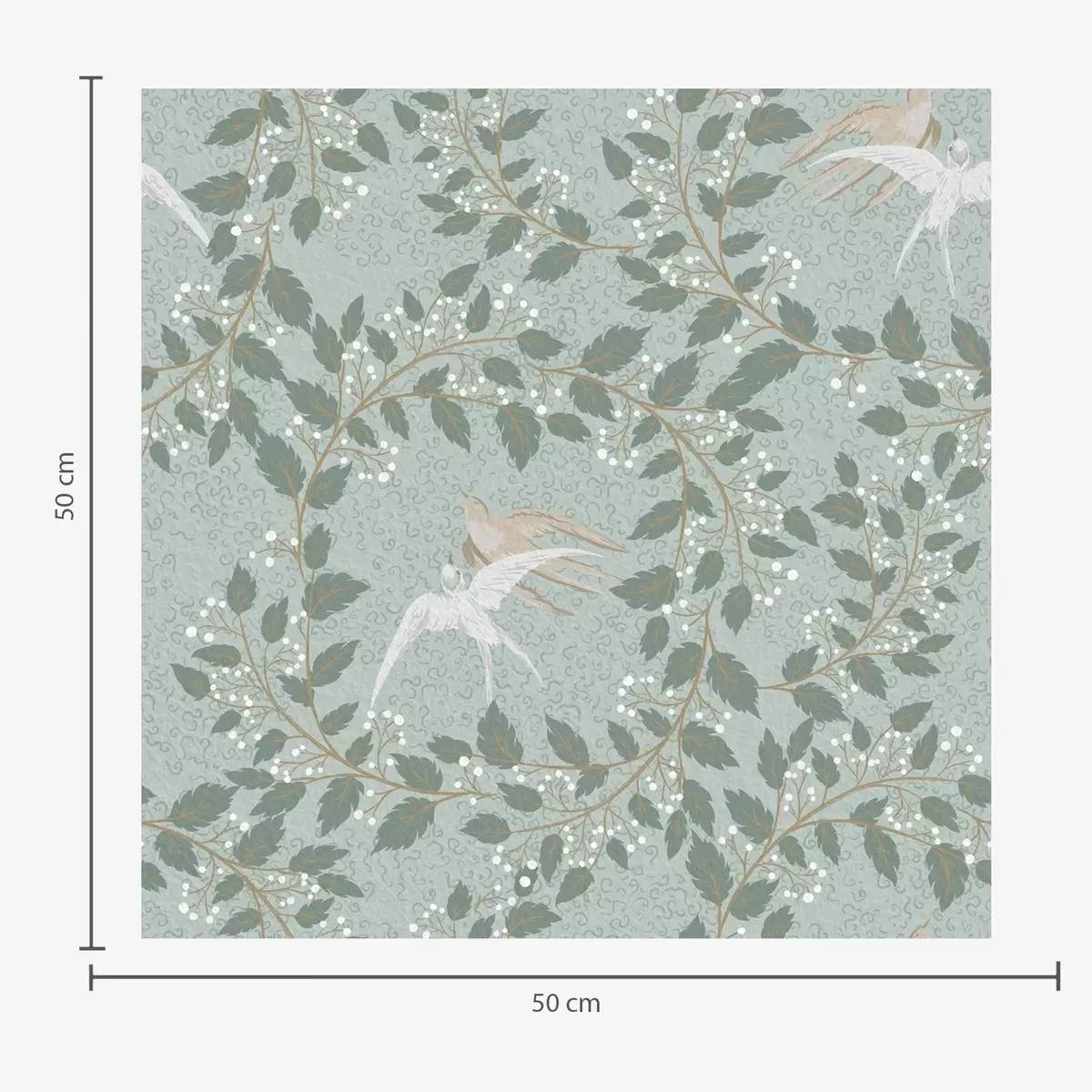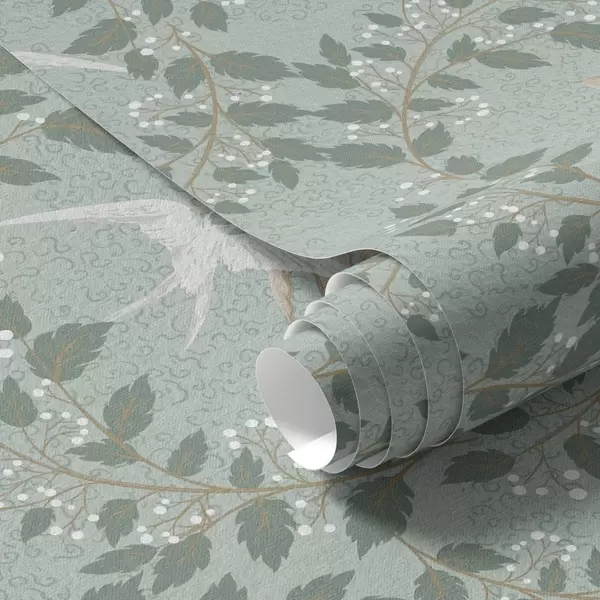 Papel tapiz Ramas con bayas blancas y pájaros sobre fondo verde Nr. a00731