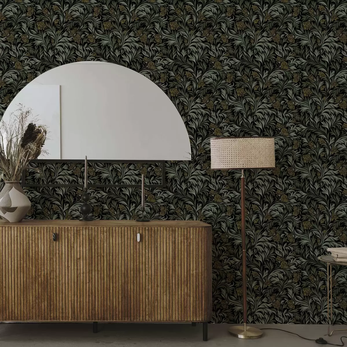 Papel tapiz Hojas oscuras de acanto con conos amarillos sobre fondo negro. Nr. a00745