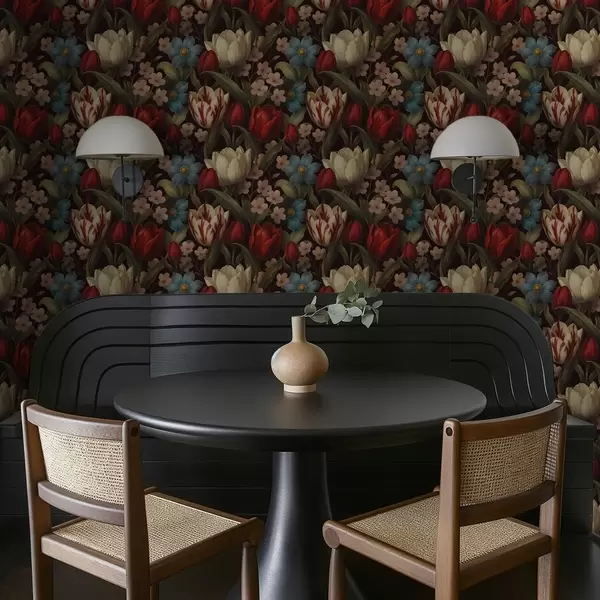 Papel tapiz Tulipanes brillantes y flores azules sobre fondo oscuro Nr. a00746