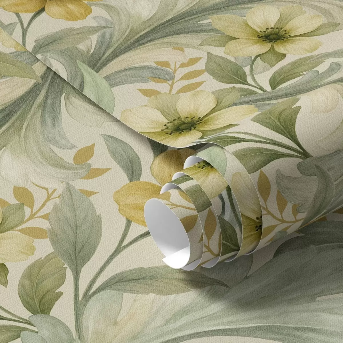 Papel tapiz Volutas de acanto con flores en tonos verdes y amarillos Nr. a00749