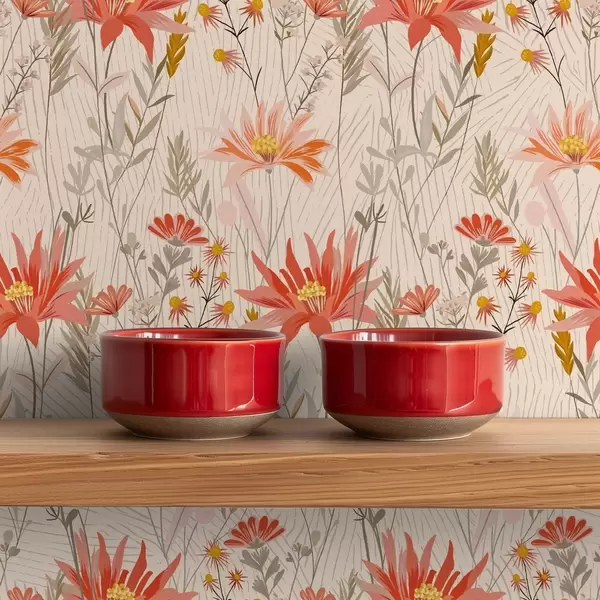 Papel tapiz Flores silvestres en tonos cálidos sobre fondo beige Nr. a00751