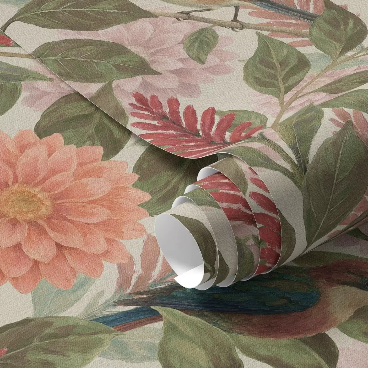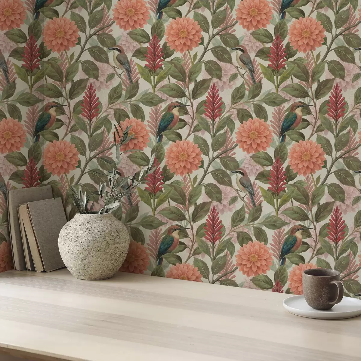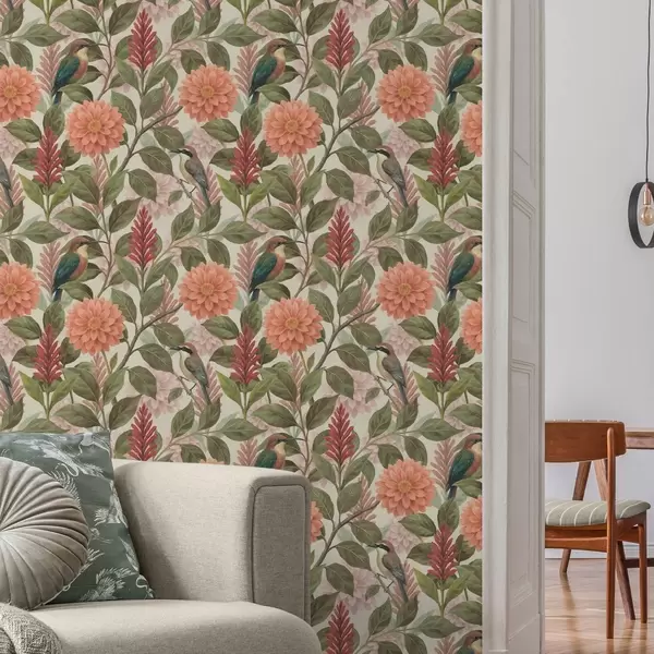 Papel tapiz Pájaros entre flores y hojas en tonos cálidos Nr. a00753