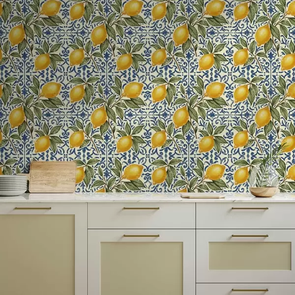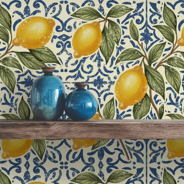 Papel tapiz Ramas de limón con fondo ornamental azul Nr. a00763