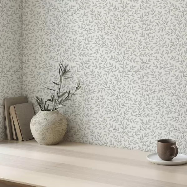 Papel tapiz Ramitas con hojas y bayas, crema clara y salvia. Nr. a00783