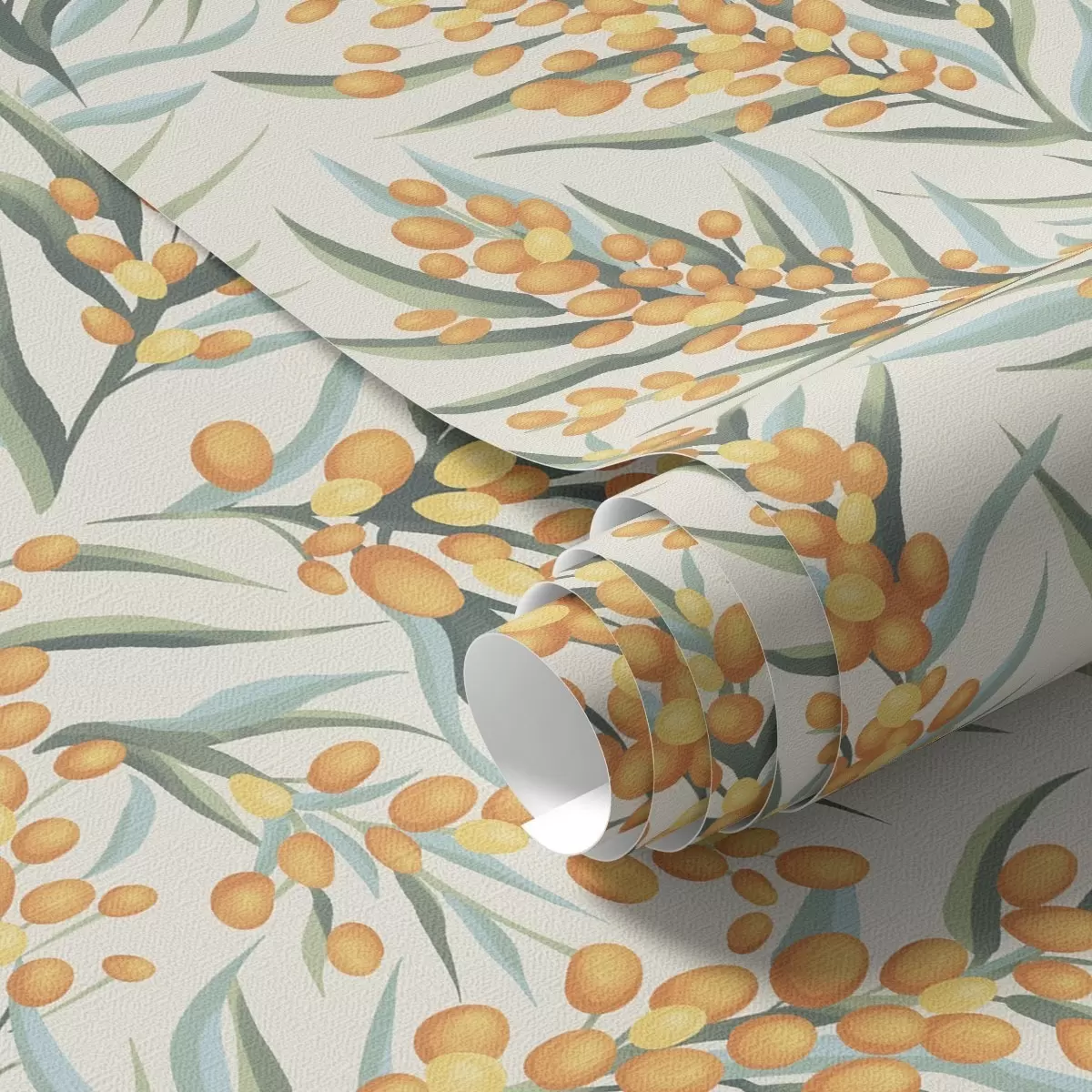 Papel tapiz Ramas de espino amarillo con bayas naranjas, fondo claro Nr. a00792