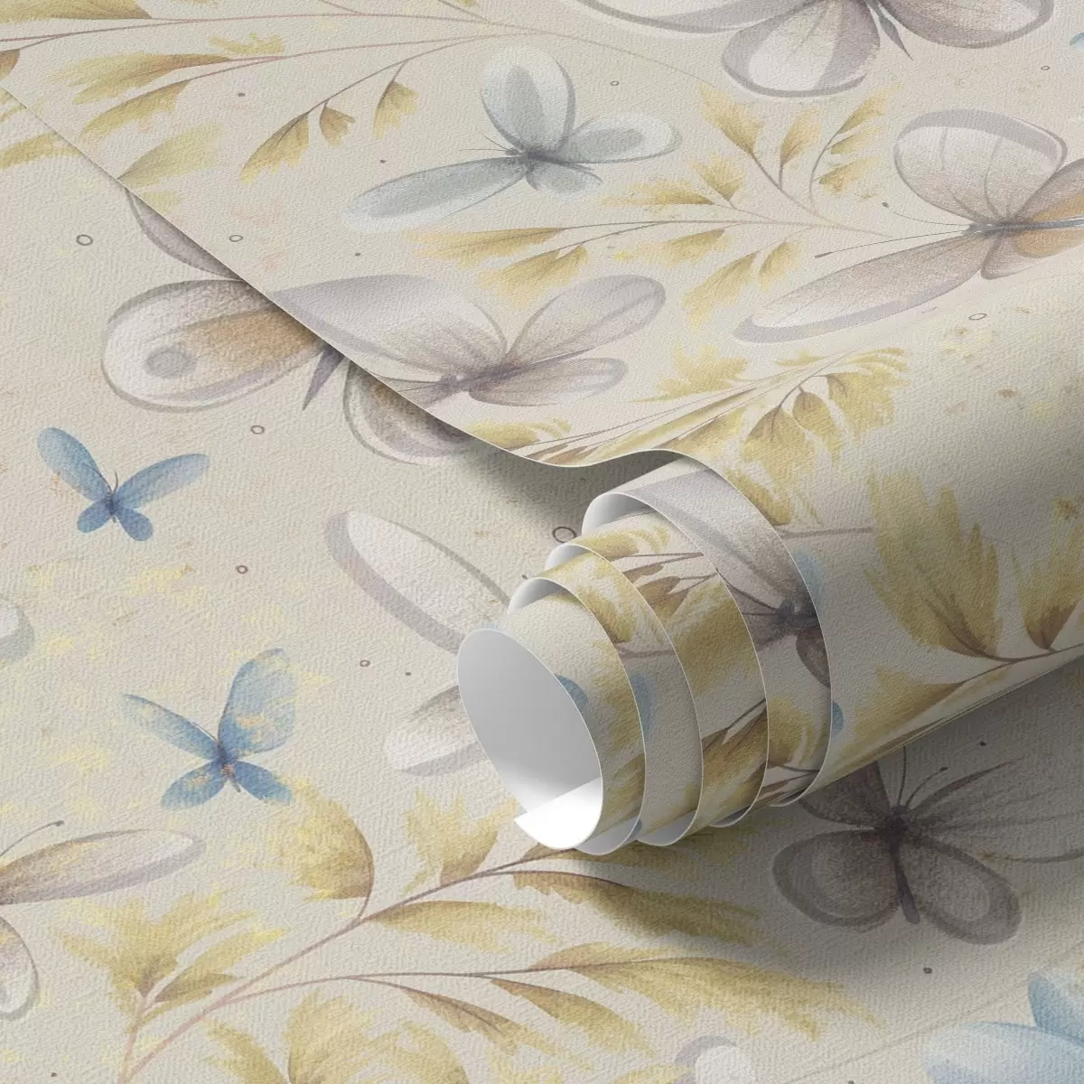 Papel tapiz Mariposas ligeras entre hojas doradas sobre un fondo claro Nr. a00795