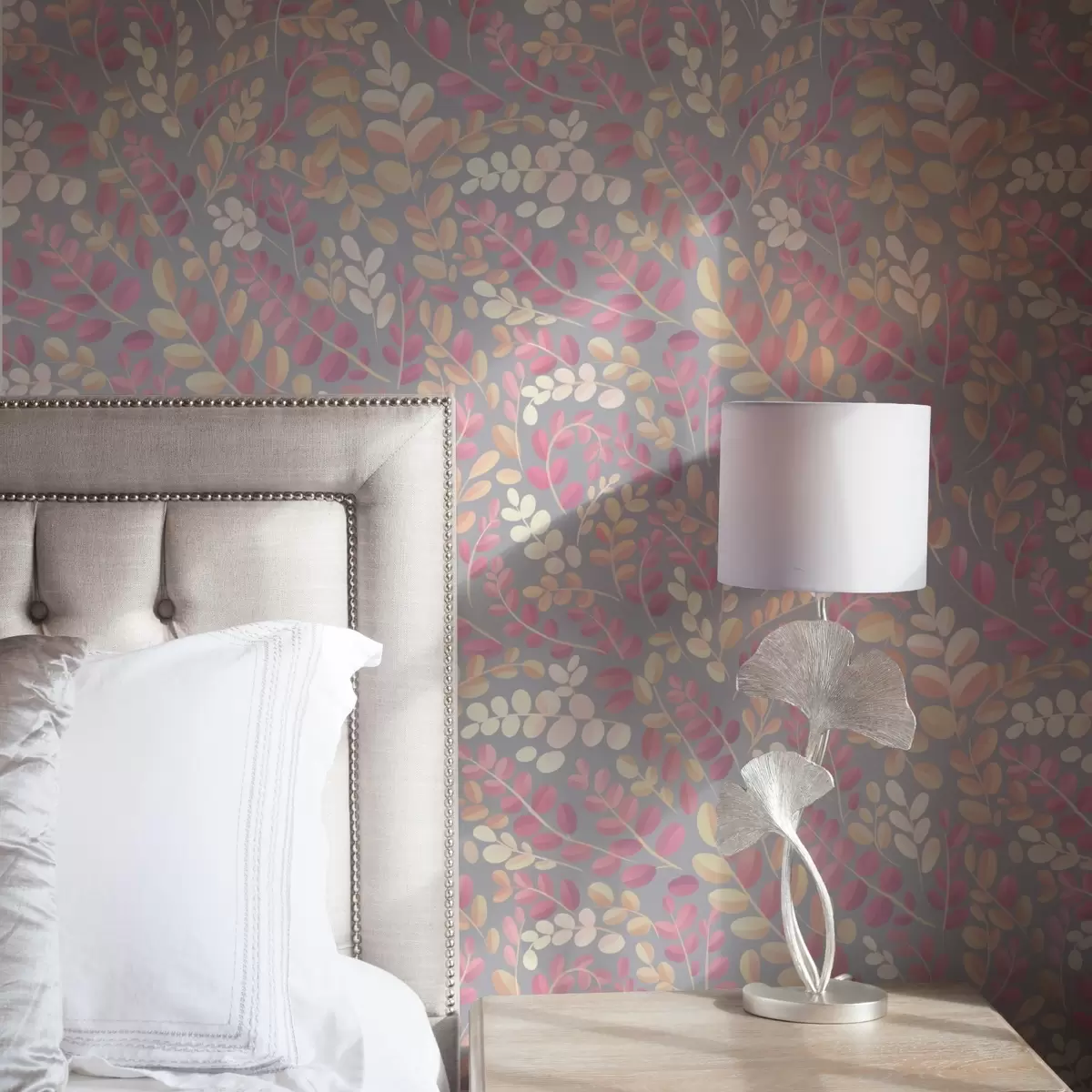 Papel tapiz Ramitas en tonos pastel con follaje rosa-melocotón sobre fondo gris Nr. a00799v1