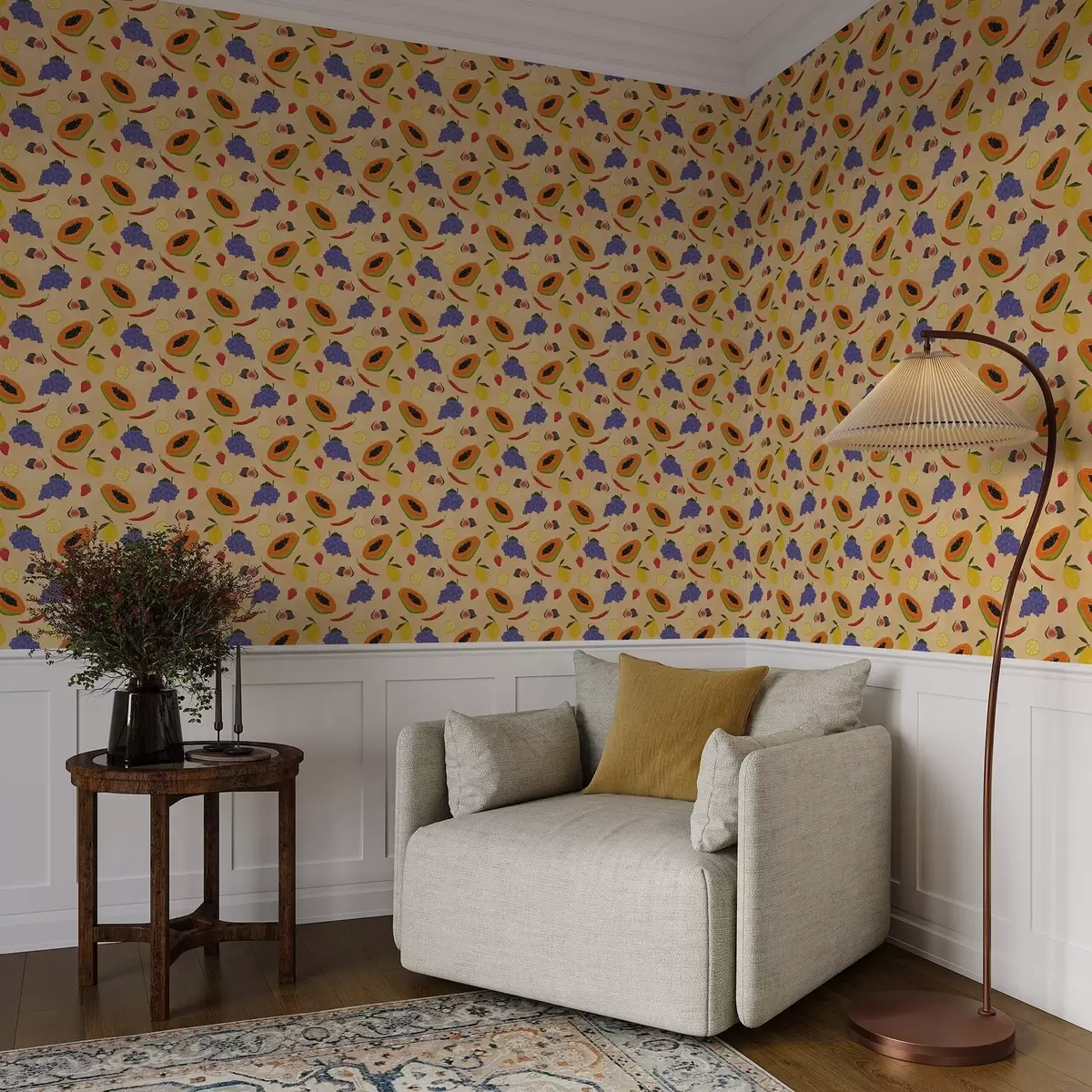 Papel tapiz Papaya, cítricos y bayas sobre un fondo cálido y rico Nr. a00803v1