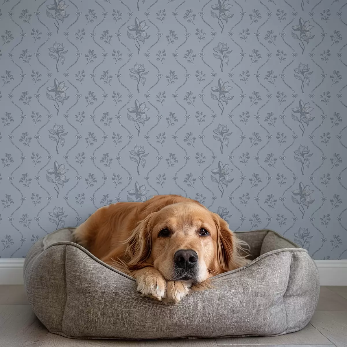 Papel tapiz Pequeñas flores y cintas en tonos gris azulado Nr. a00808v2