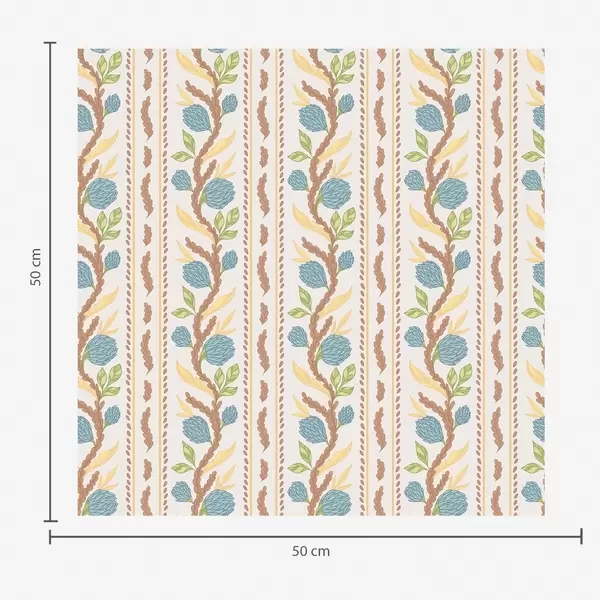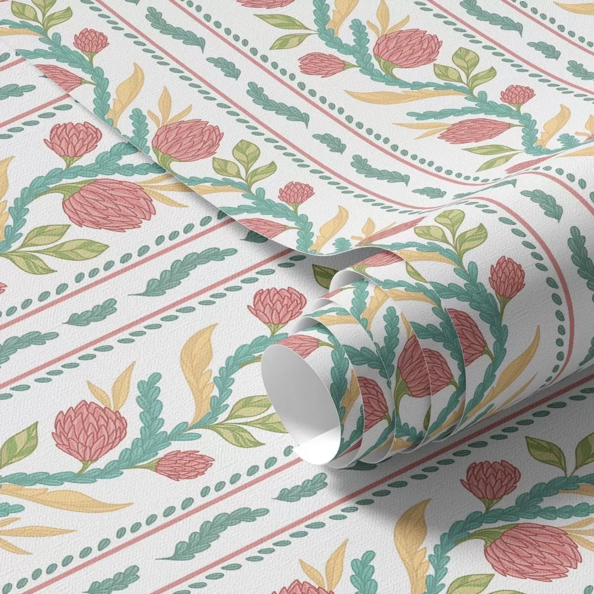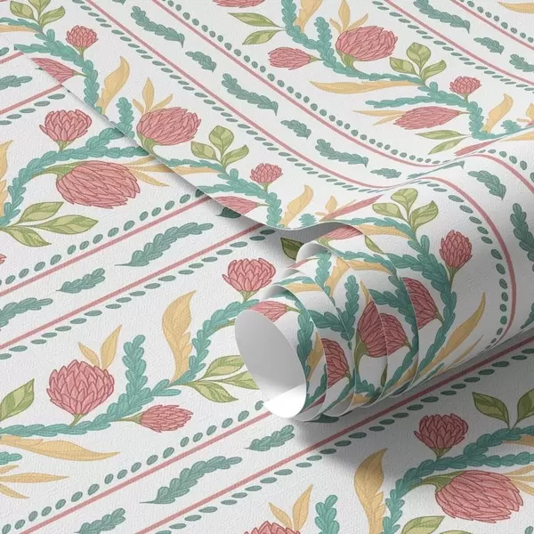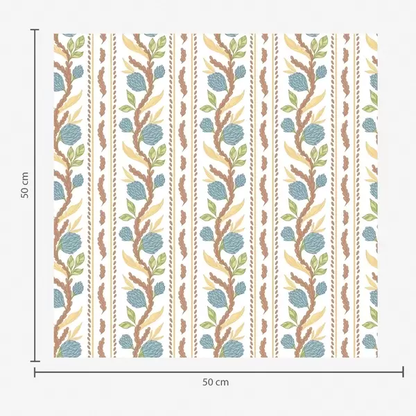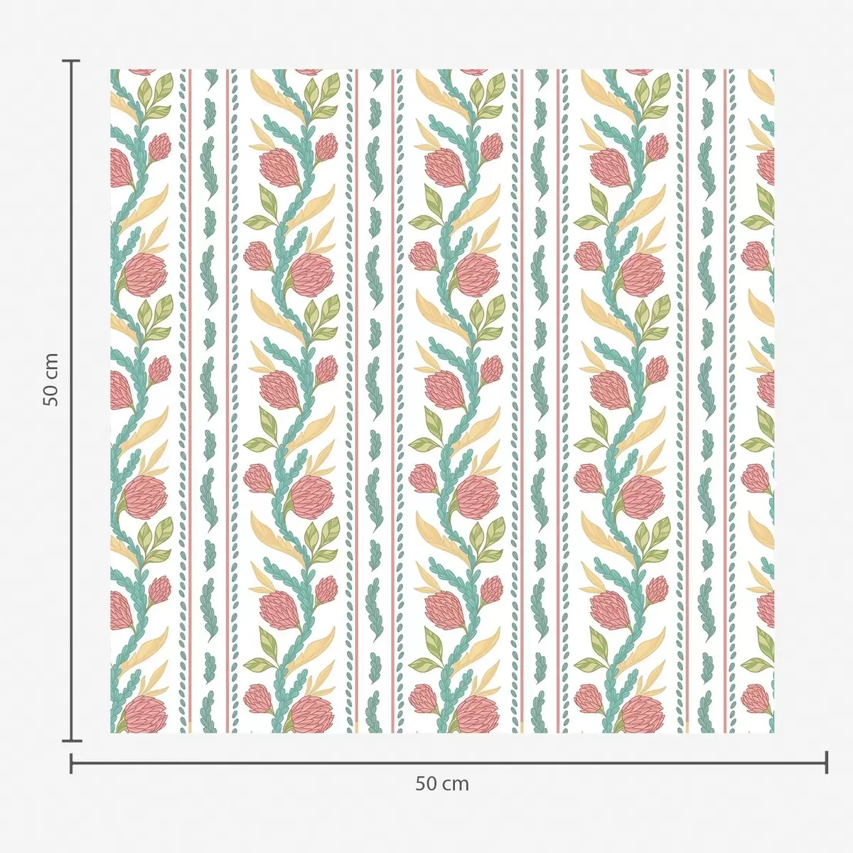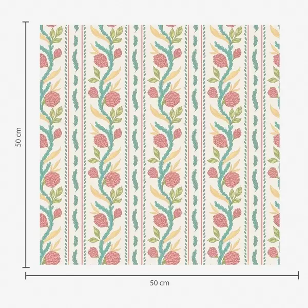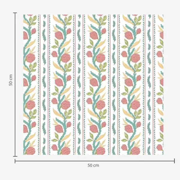 Papel tapiz Rayas verticales con flores de coral y hojas turquesas. Nr. a00816