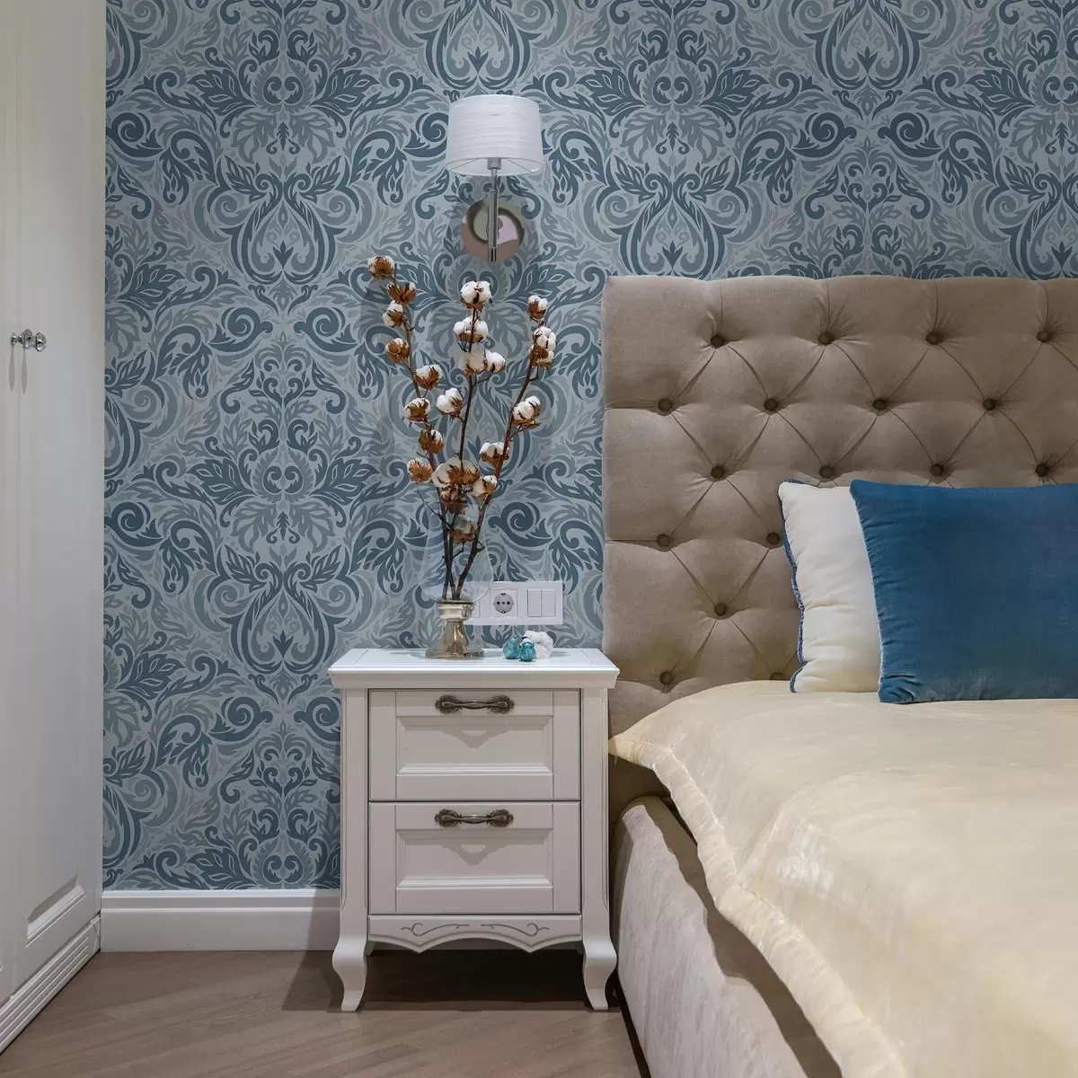 Papel tapiz Damasco clásico, azul oscuro sobre azul claro. Nr. a00826