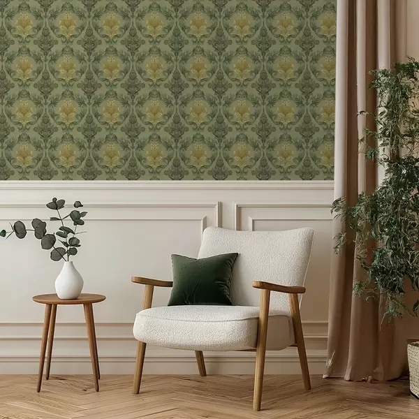 Papel tapiz Damasco con volutas vegetales, paleta de colores oliva y ocre. Nr. a00828