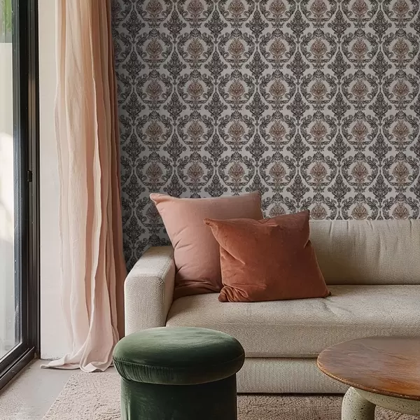 Papel tapiz Damasco con detalles en marrón cobrizo sobre fondo claro. Nr. a00828v4