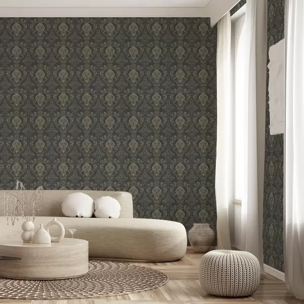 Papel tapiz Damasco sobre fondo grafito oscuro, detalles en ocre oliva. Nr. a00828v5