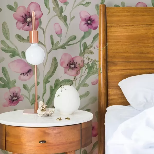 Papel tapiz Delicadas amapolas rosas con hojas en técnica acuarela Nr. a00830