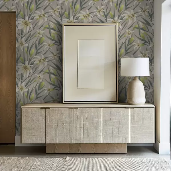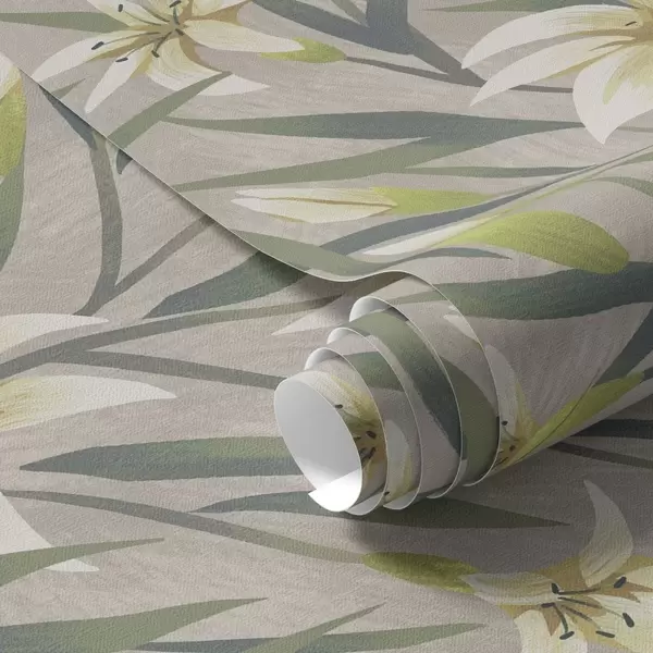 Papel tapiz Lirios crema con hojas sobre fondo gris-beige Nr. a00837