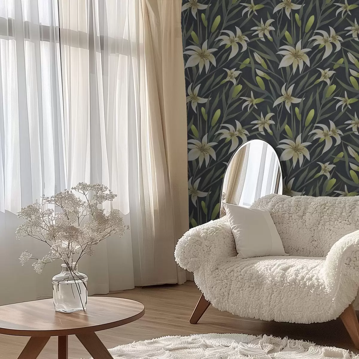 Papel tapiz Lirios crema con hojas sobre fondo oscuro Nr. a00837v1