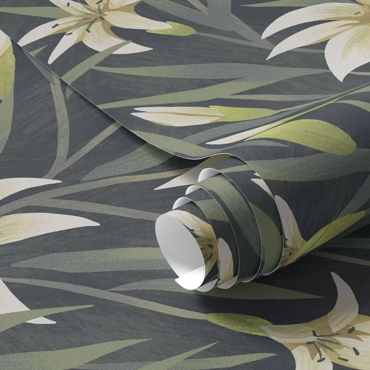 Papel tapiz Lirios crema con hojas sobre fondo oscuro Nr. a00837v1