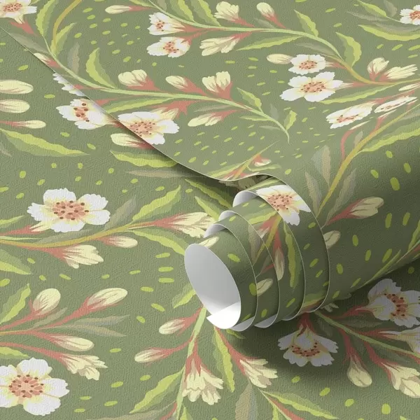 Papel tapiz Ramas con flores color crema sobre fondo oliva. Nr. a00850