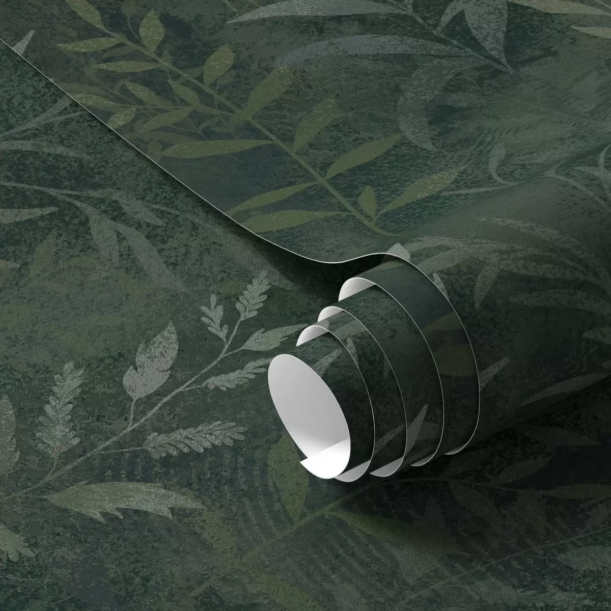 Papel tapiz Fondo verde oscuro con ramas de hojas translúcidas. Nr. a00888