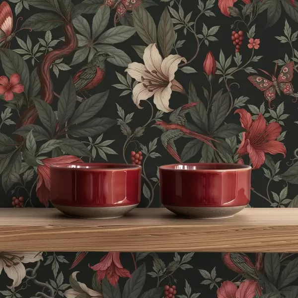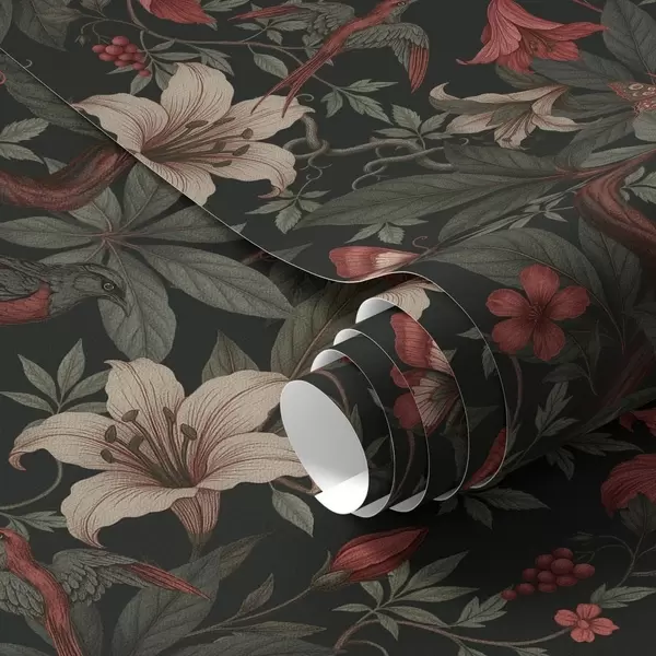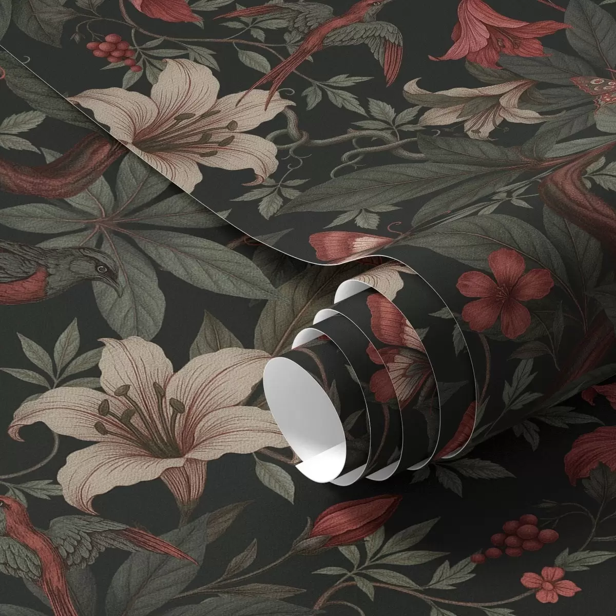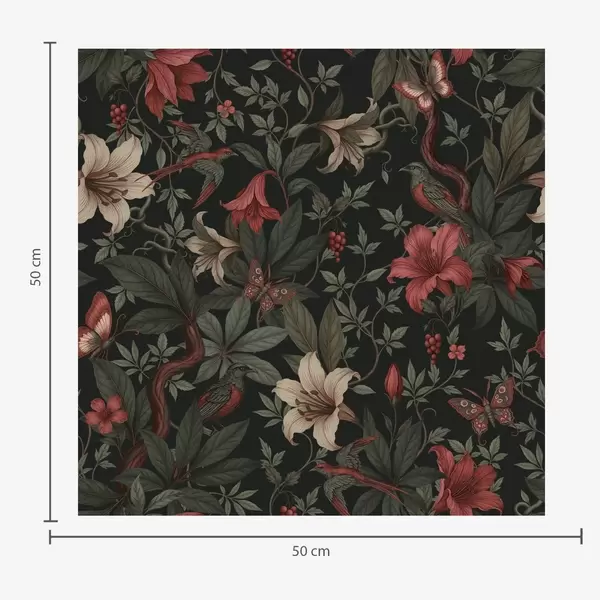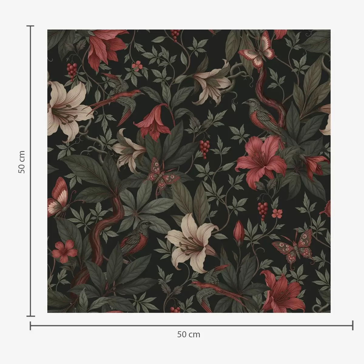 Papel tapiz Flores oscuras de la selva con pájaros y mariposas Nr. a00895