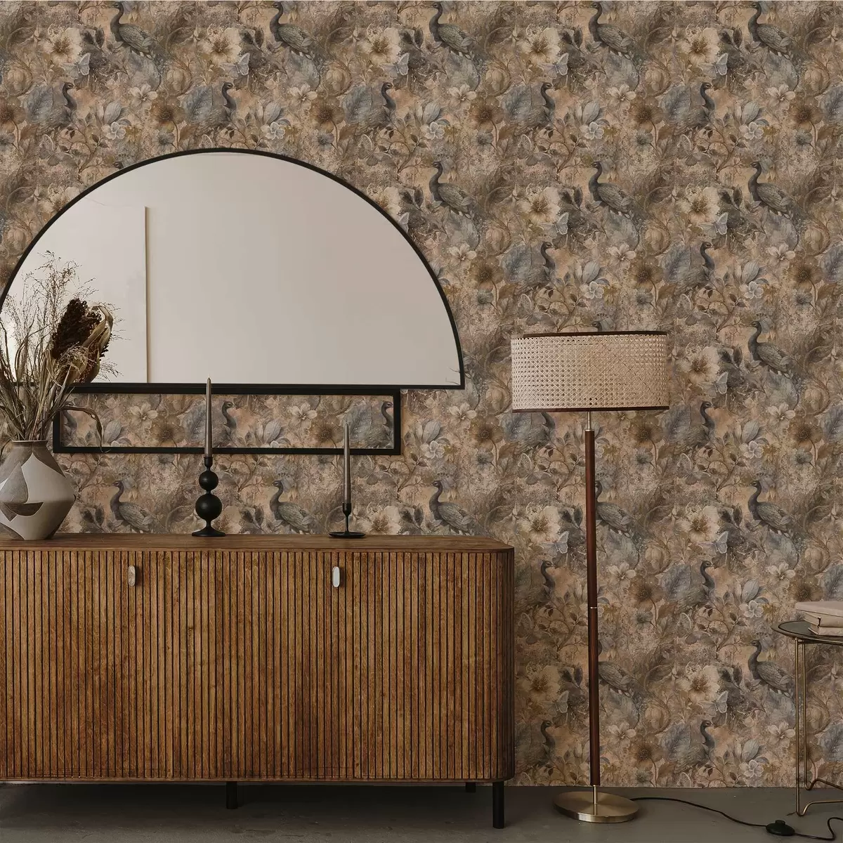 Papel tapiz Collage floral envejecido con pavos reales y mariposas Nr. a00897
