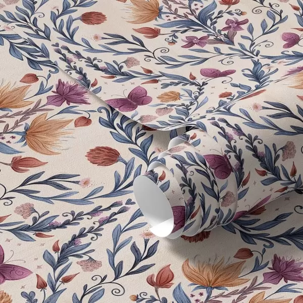 Papel tapiz Damasco floral con mariposas sobre fondo melocotón suave. Nr. a00926