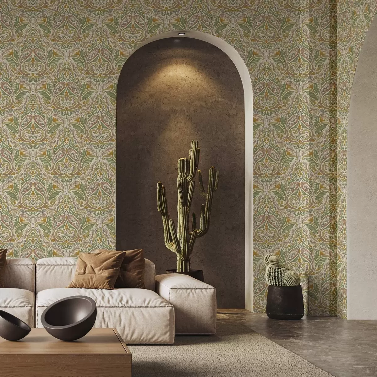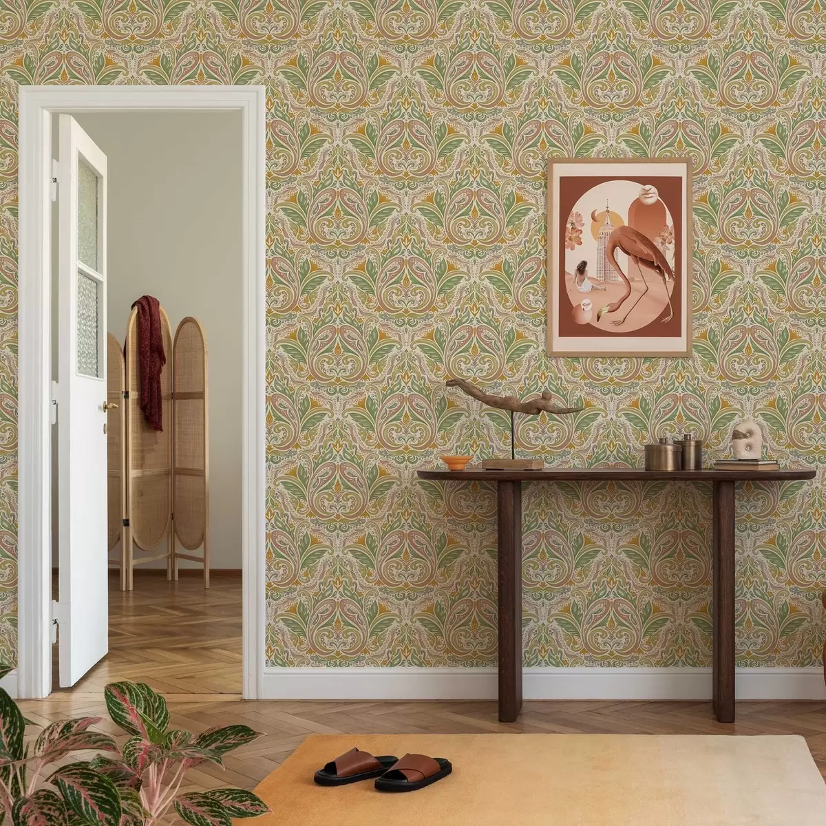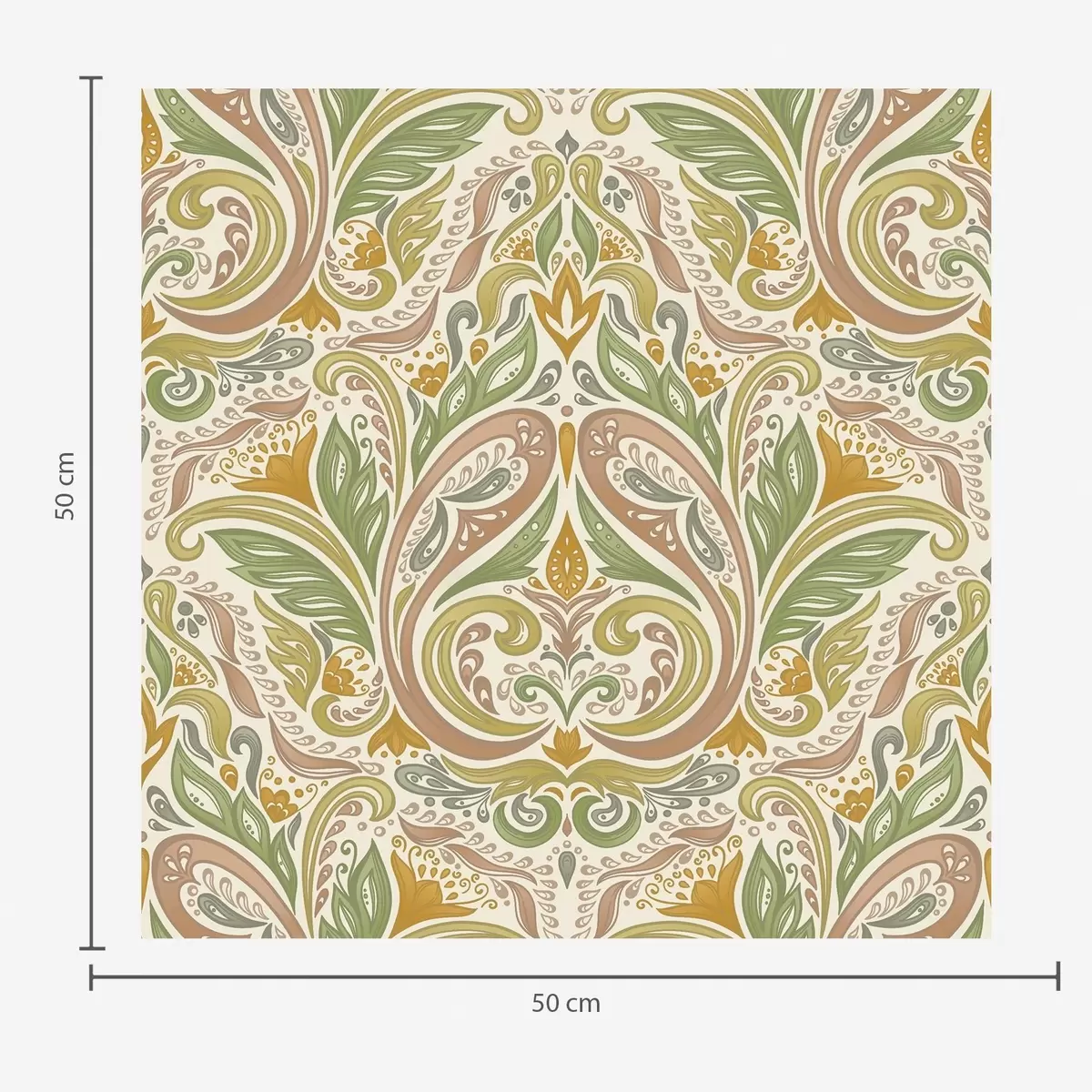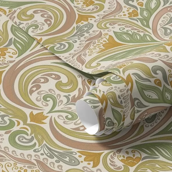 Papel tapiz Remolinos ornamentales con hojas en tonos verdes y terracota. Nr. a00927v1