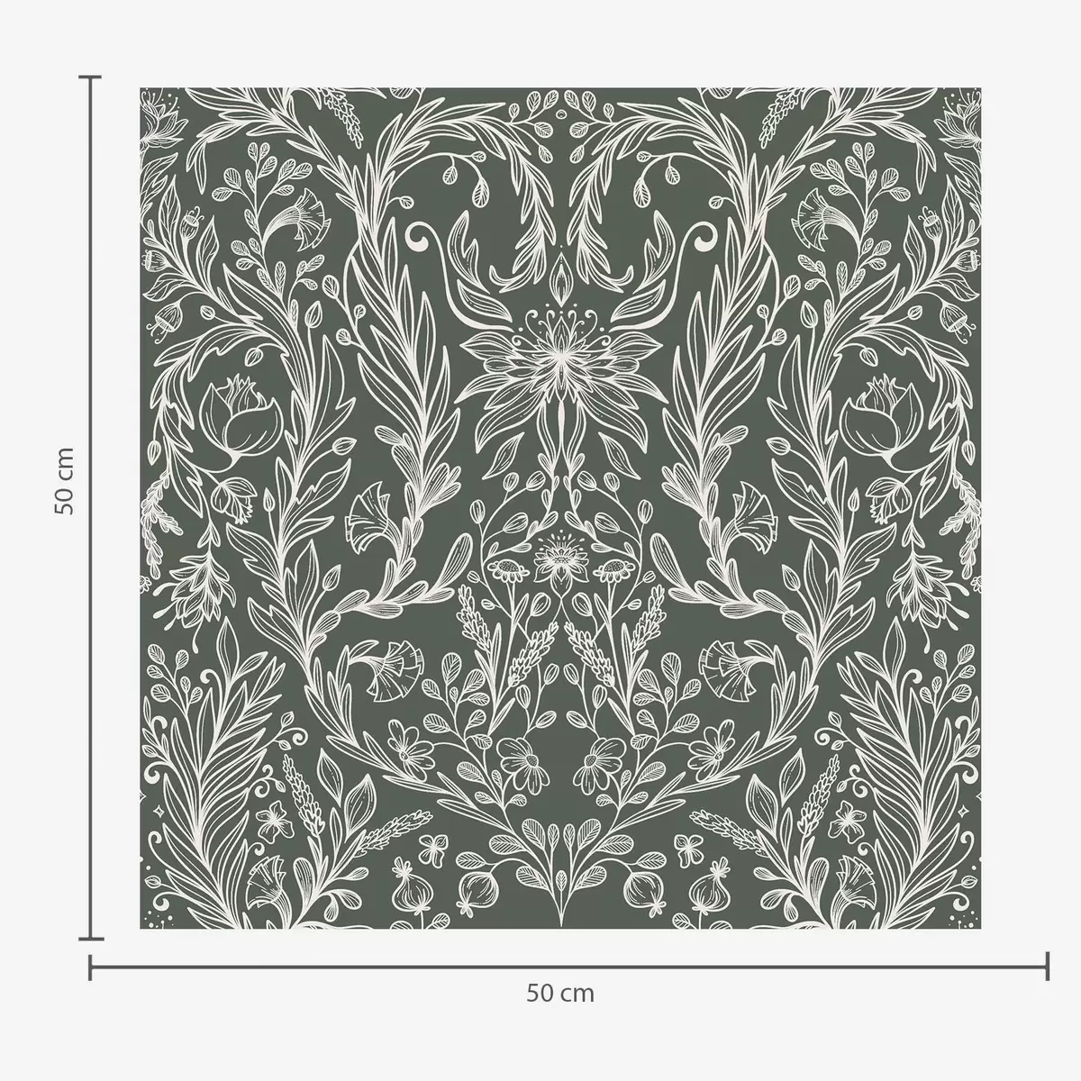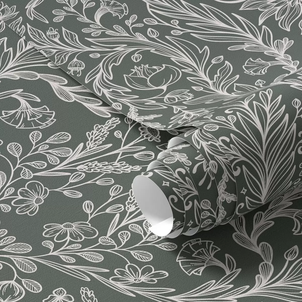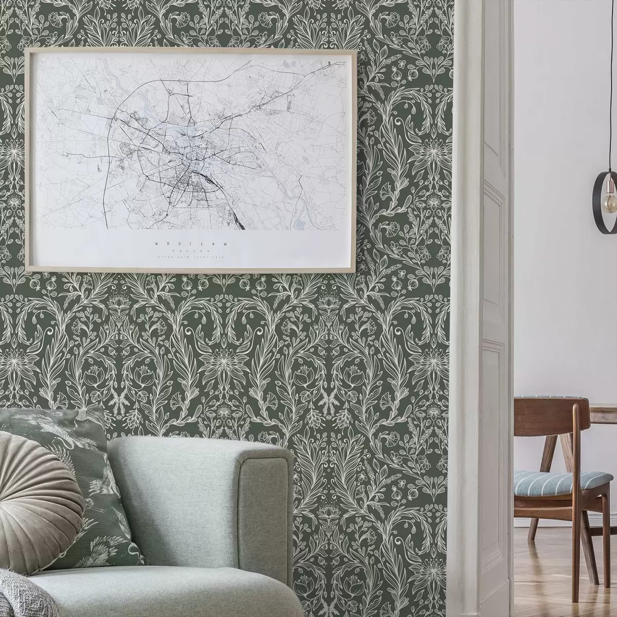 Papel tapiz Diseño floral lineal sobre fondo verde oscuro. Nr. a00929
