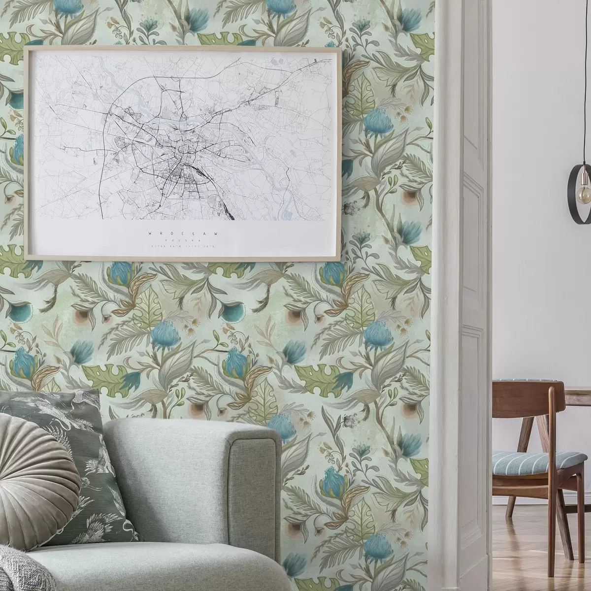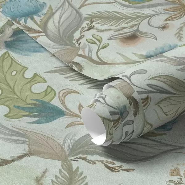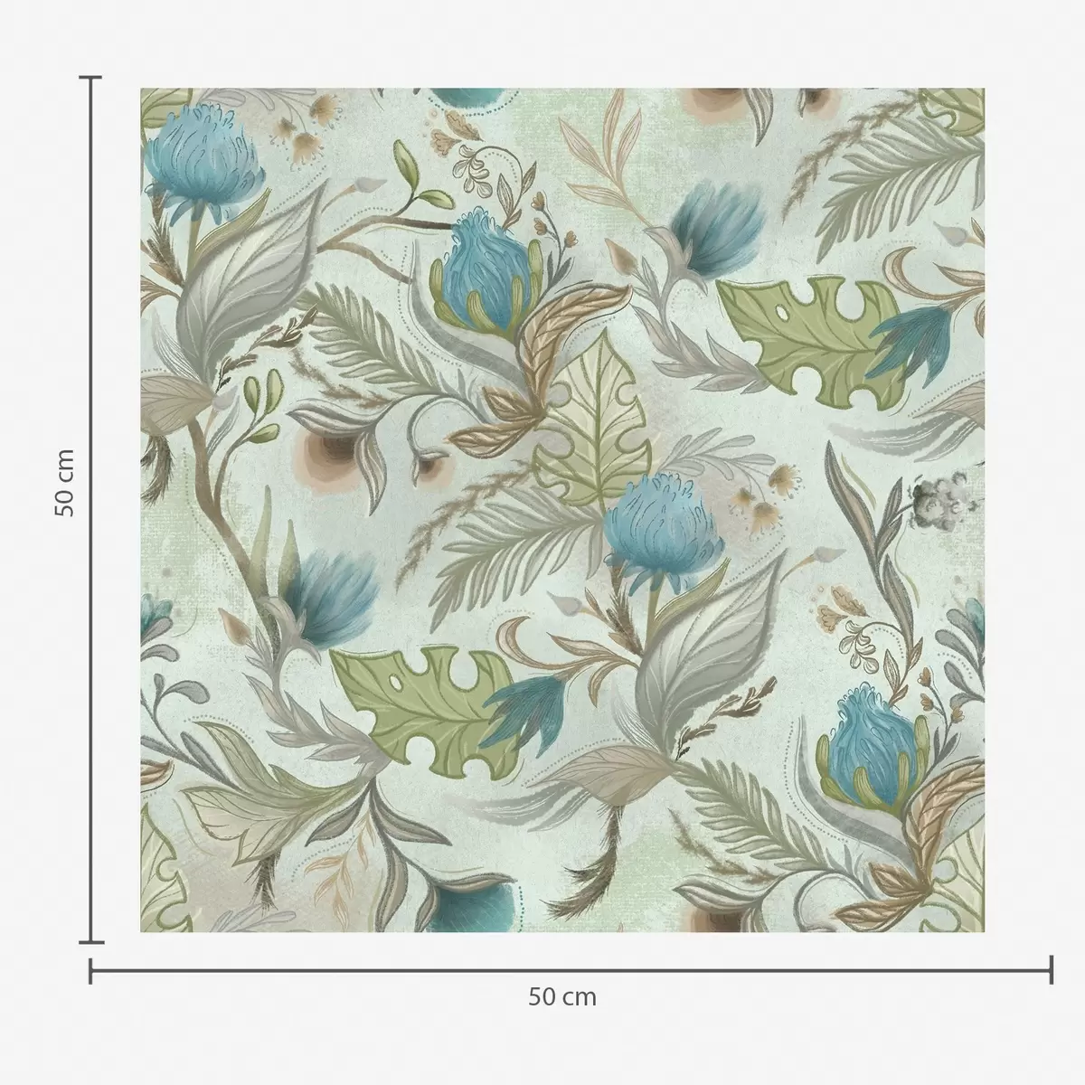 Papel tapiz Flores azules y vegetación sobre un suave fondo menta. Nr. a00930v1