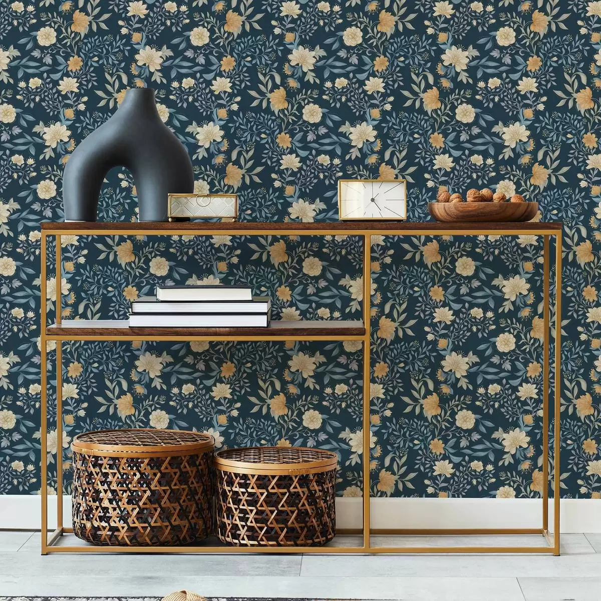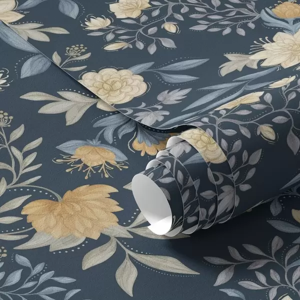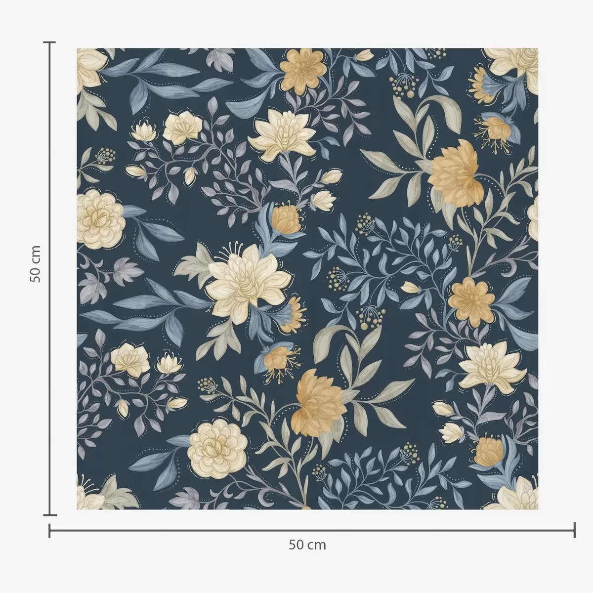 Papel tapiz Flores amarillas y azules sobre un fondo azul oscuro vespertino. Nr. a00934v1