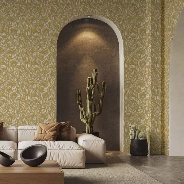 Papel tapiz Adorno foliado de color blanco crema sobre un fondo ocre cálido Nr. a00940v1