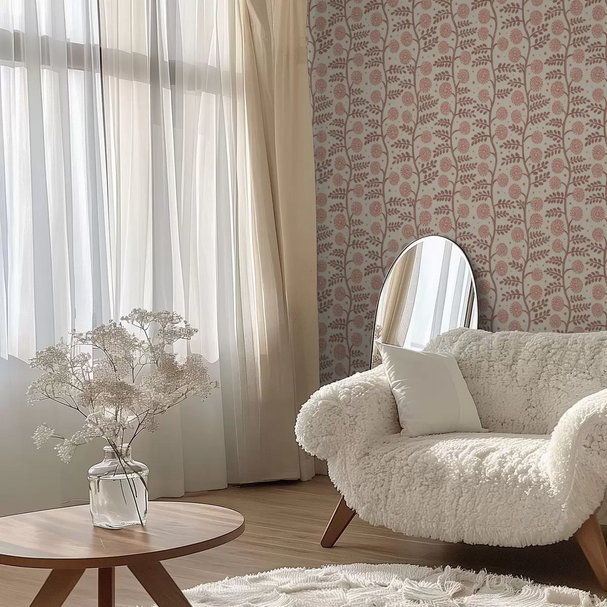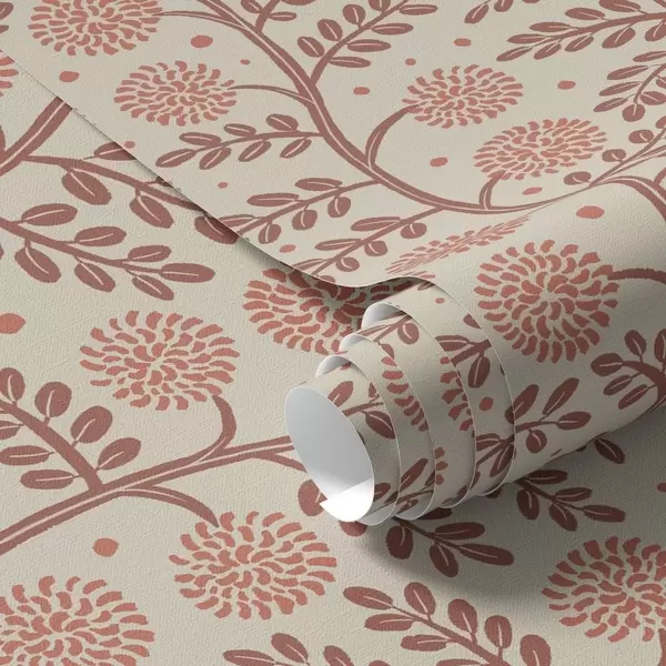 Papel tapiz Tallos de terracota con flores coralinas y esponjosas sobre fondo crema. Nr. a00997v1