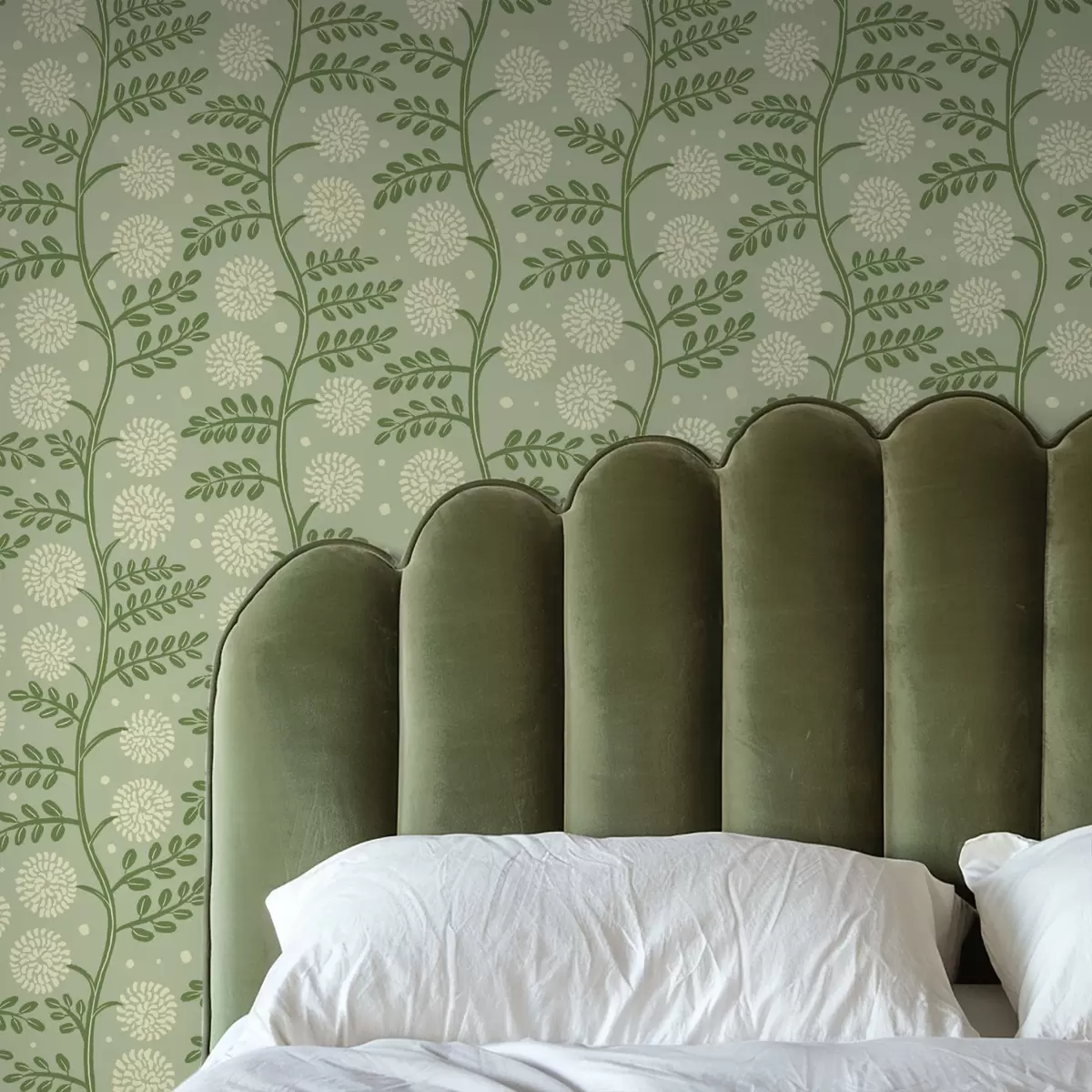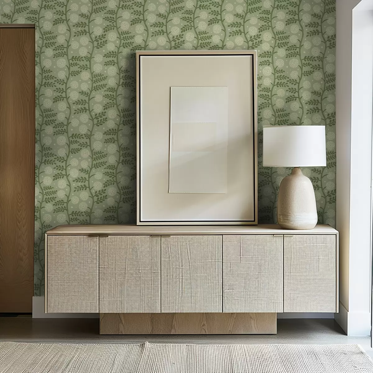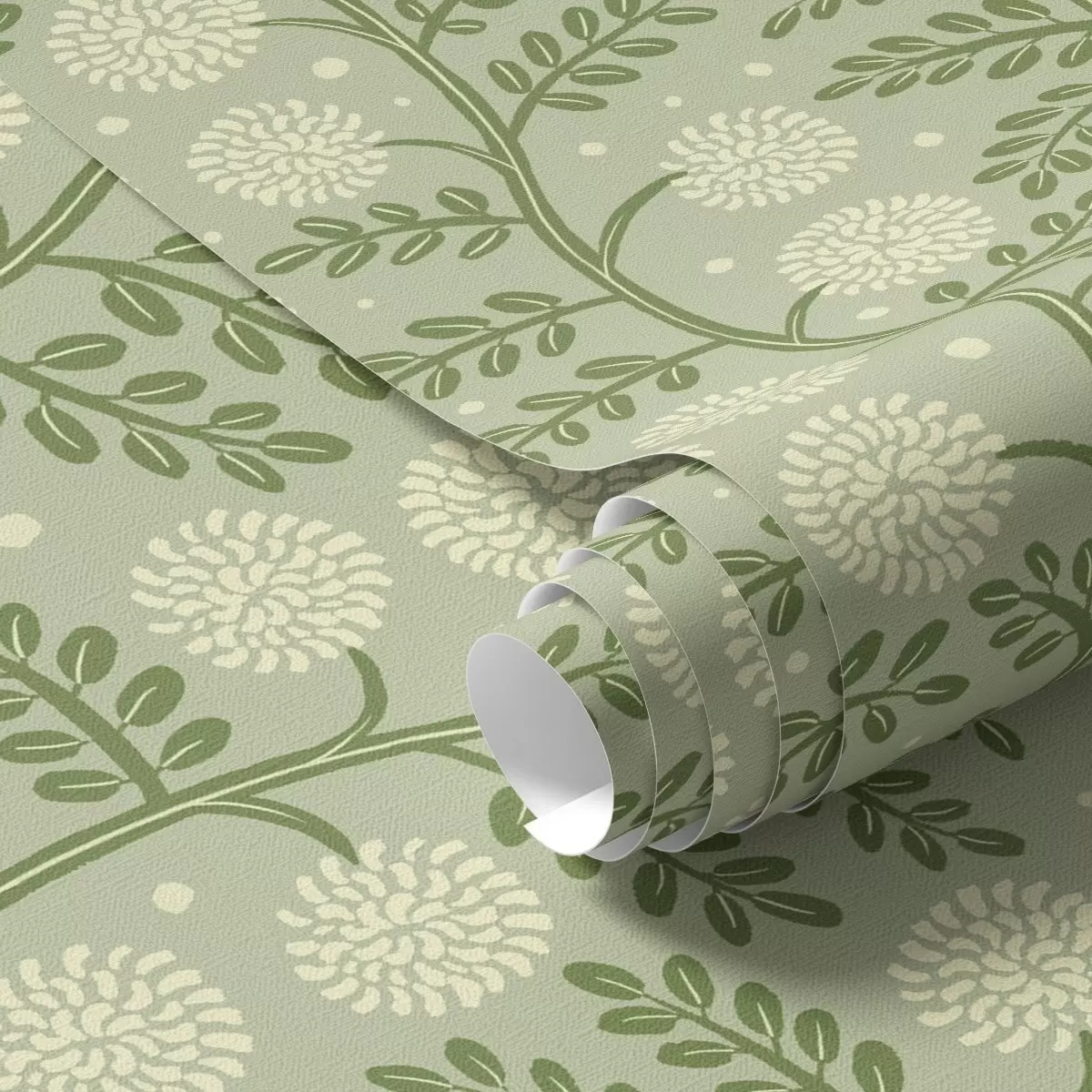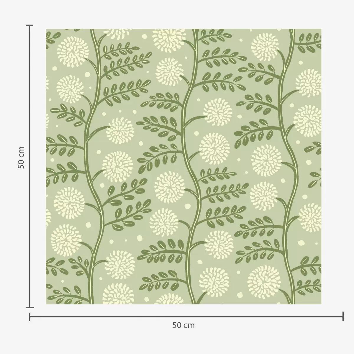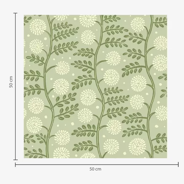 Papel tapiz Tallos verde salvia con flores esponjosas de color marfil y lunares. Nr. a00997v2