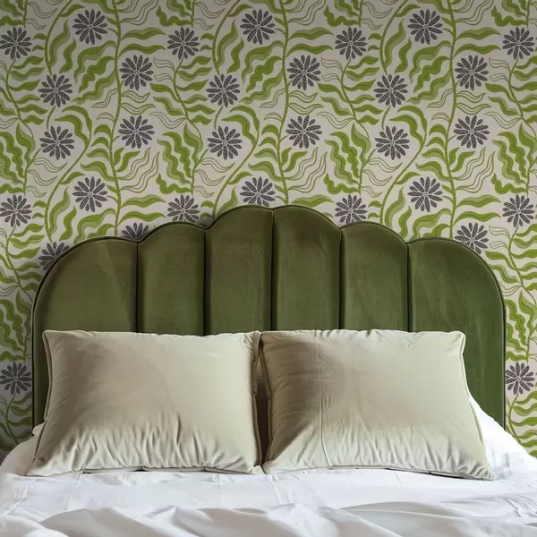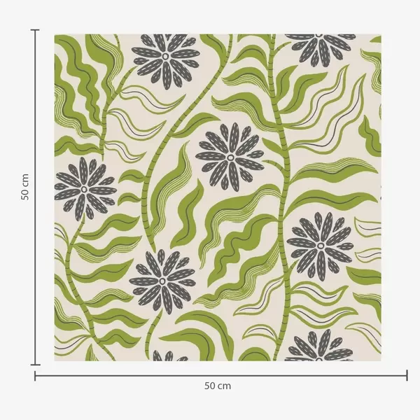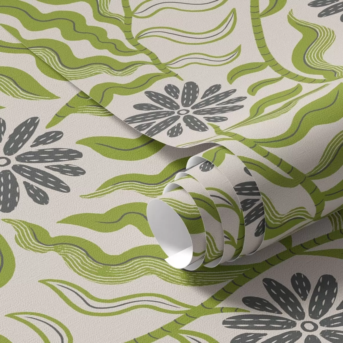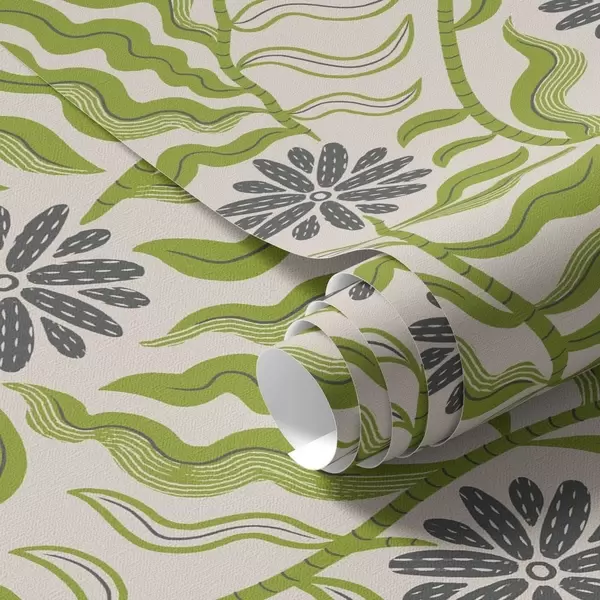 Papel tapiz Divertidas margaritas verdes con hojas onduladas sobre fondo crema. Nr. a00998