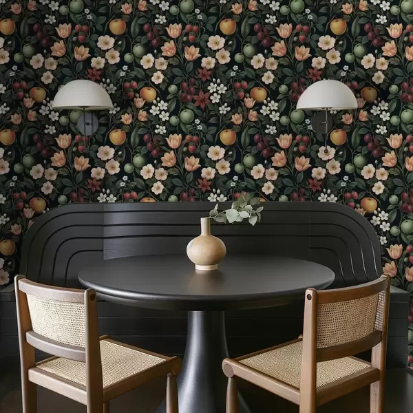 Papel tapiz Jardín oscuro con flores, manzanas maduras y bayas Nr. a01034