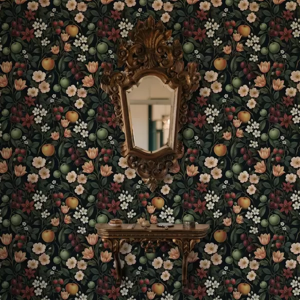 Papel tapiz Jardín oscuro con flores, manzanas maduras y bayas Nr. a01034