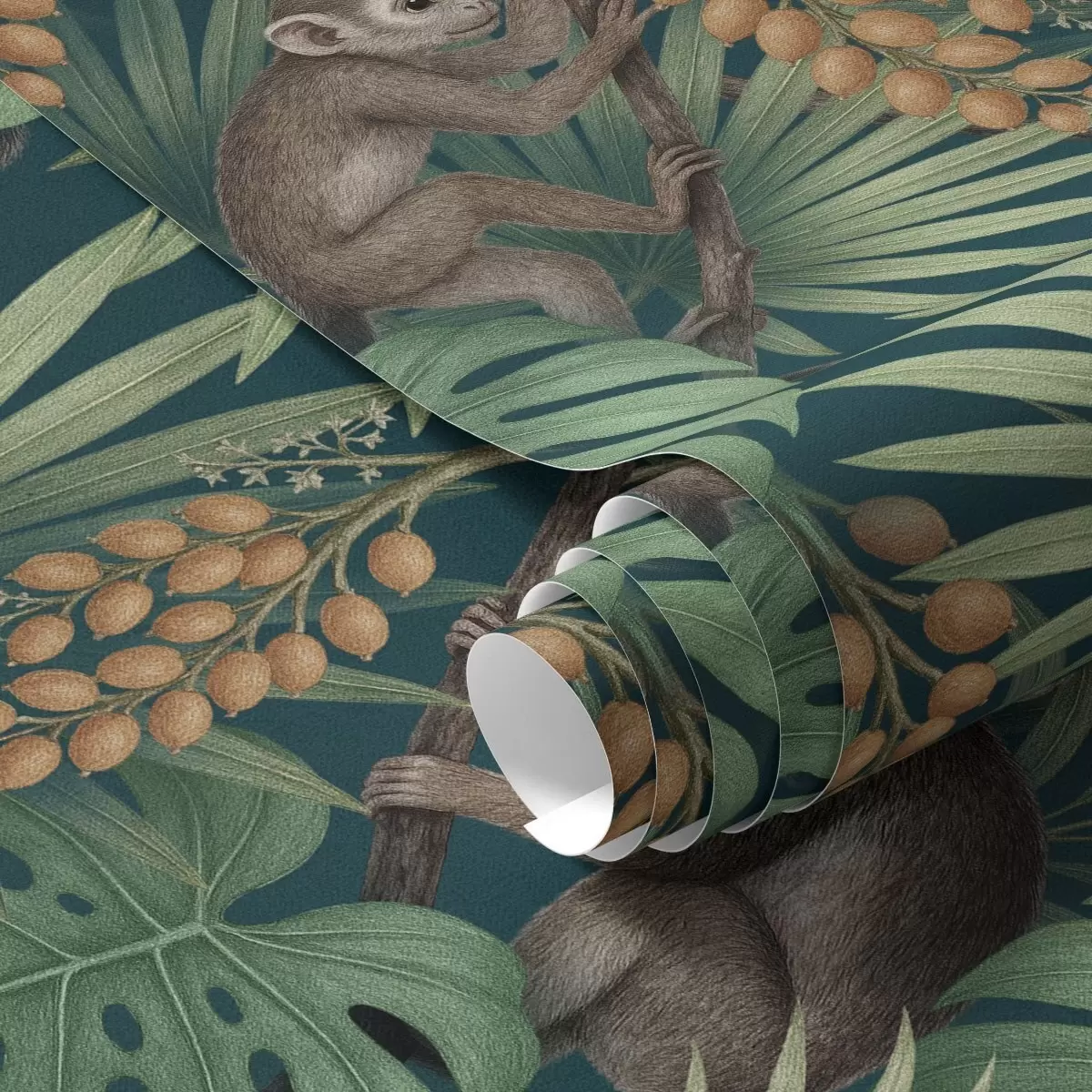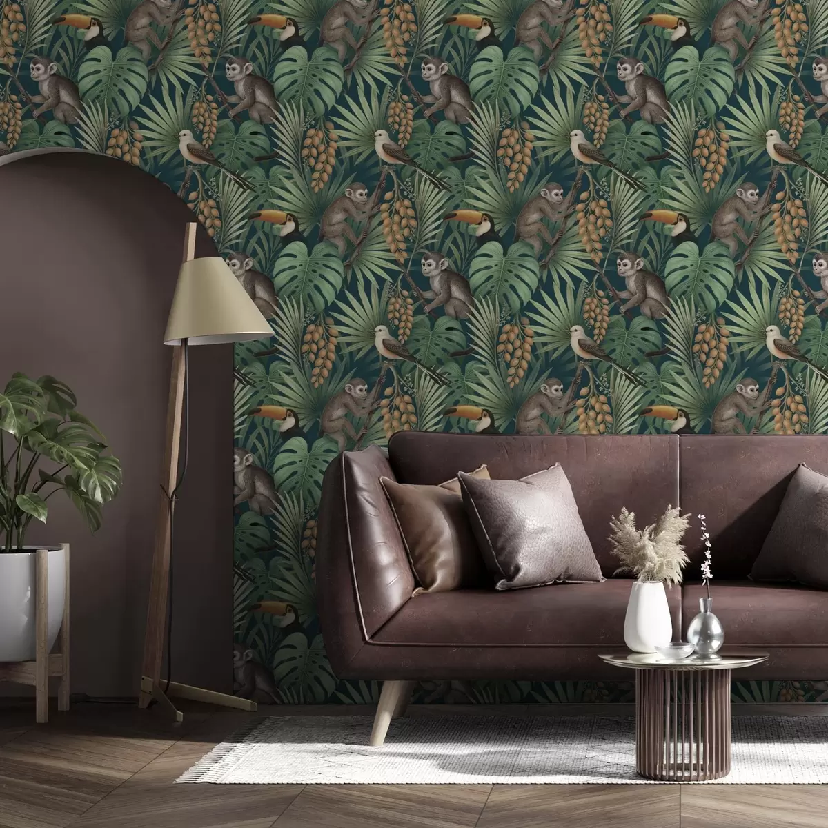Papel tapiz Monos y aves tropicales en la densa vegetación de la selva. Nr. a01037